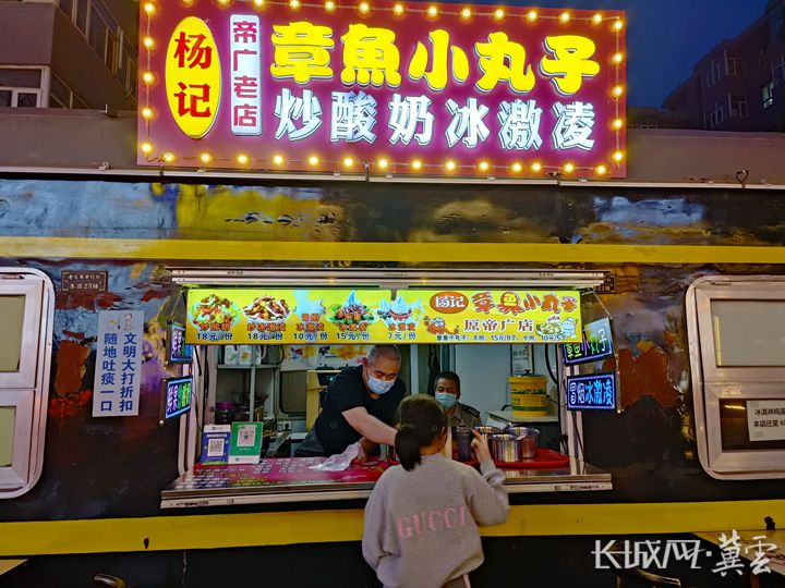 老杨做这一行已经20多年了,2021年春节前,京张铁路老站旧址被开发成了老火车步行街。“我觉得这条街既有文化底蕴,又在公园附近,人流肯定少不了,就从帝广商业街搬了过来。现在每天下午5点多开始上人,到深夜热闹劲儿才过,收入不错,足够支应一家子的开销。”老杨说着,又开始起锅烧油。