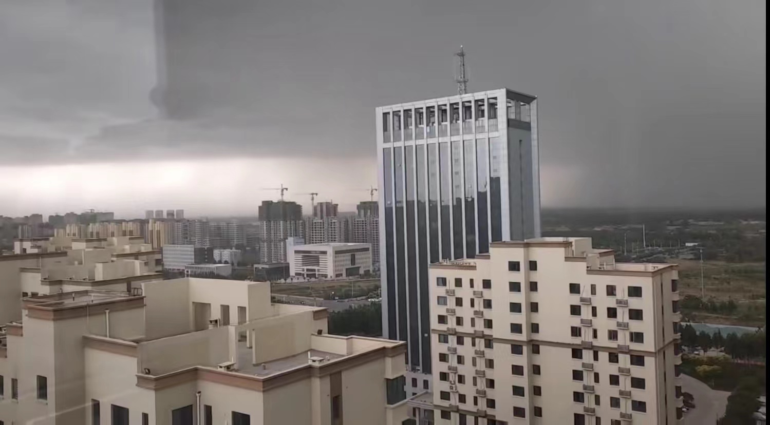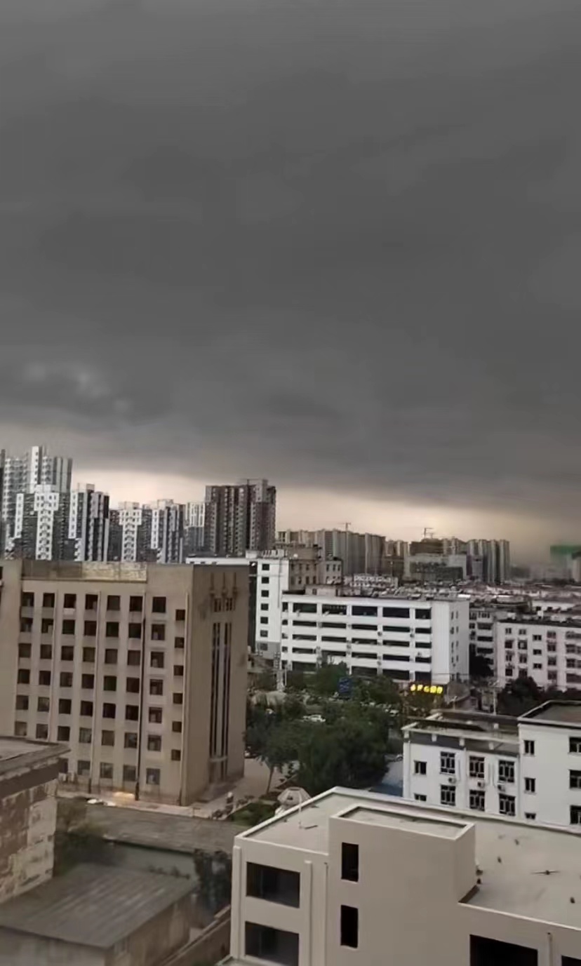 乌云压城的一瞬间就像灾难电影的场景一般,天空瞬时暗了下来,尤其是住在高层的市民观感更为突出,天边黑云的边界煞是明显。这场急雨给还忙着下班、接孩子放学的市民来了个措手不及,很多人没带雨具,冒着雨在街上骑车狂奔,大风卷着风沙吹的人都睁不开眼睛。正在麦收的农田里,农机手也加快速度在大风大雨中抢收粮食。突来的大风还将市区火车站附近一抱粗的大树连根拔起,砸到停放在附近的出租车上。