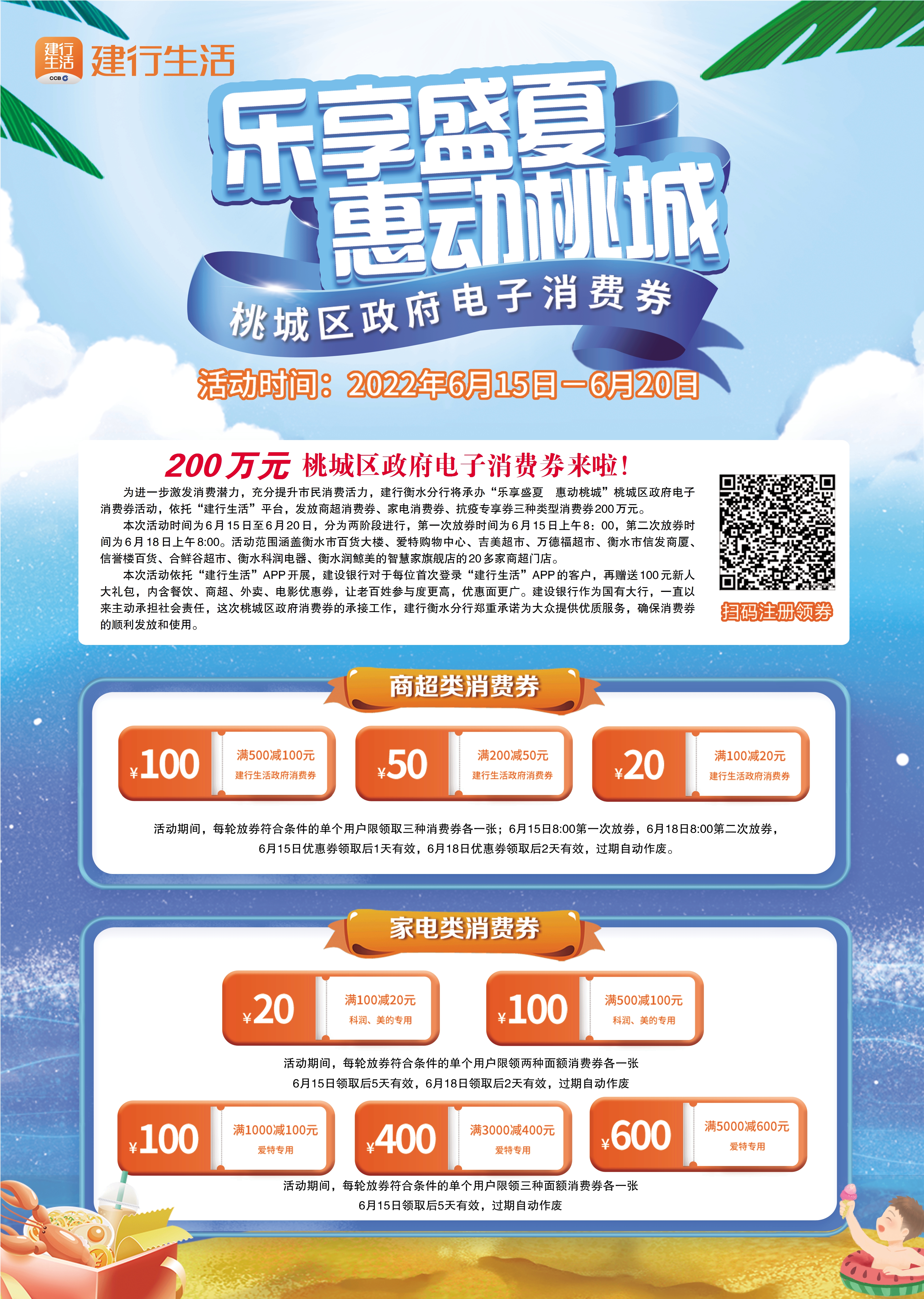 为进一步激发消费潜力,充分提升市民消费活力,建行衡水分行将承办“乐享盛夏 惠动桃城”桃城区政府电子消费券活动,依托“建行生活”平台,发放商超消费券、家电消费券、抗疫专享券三种类型消费券200万元。