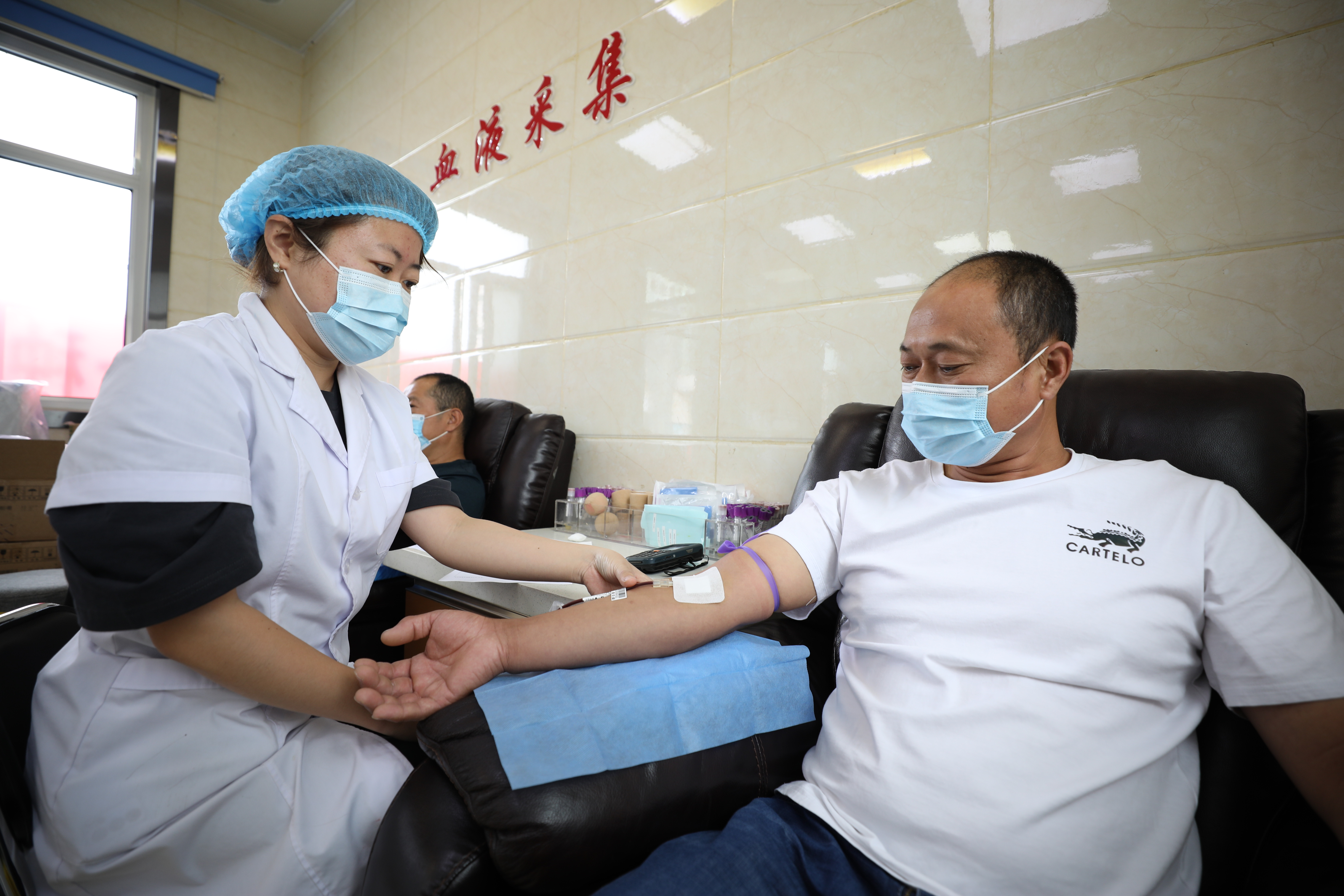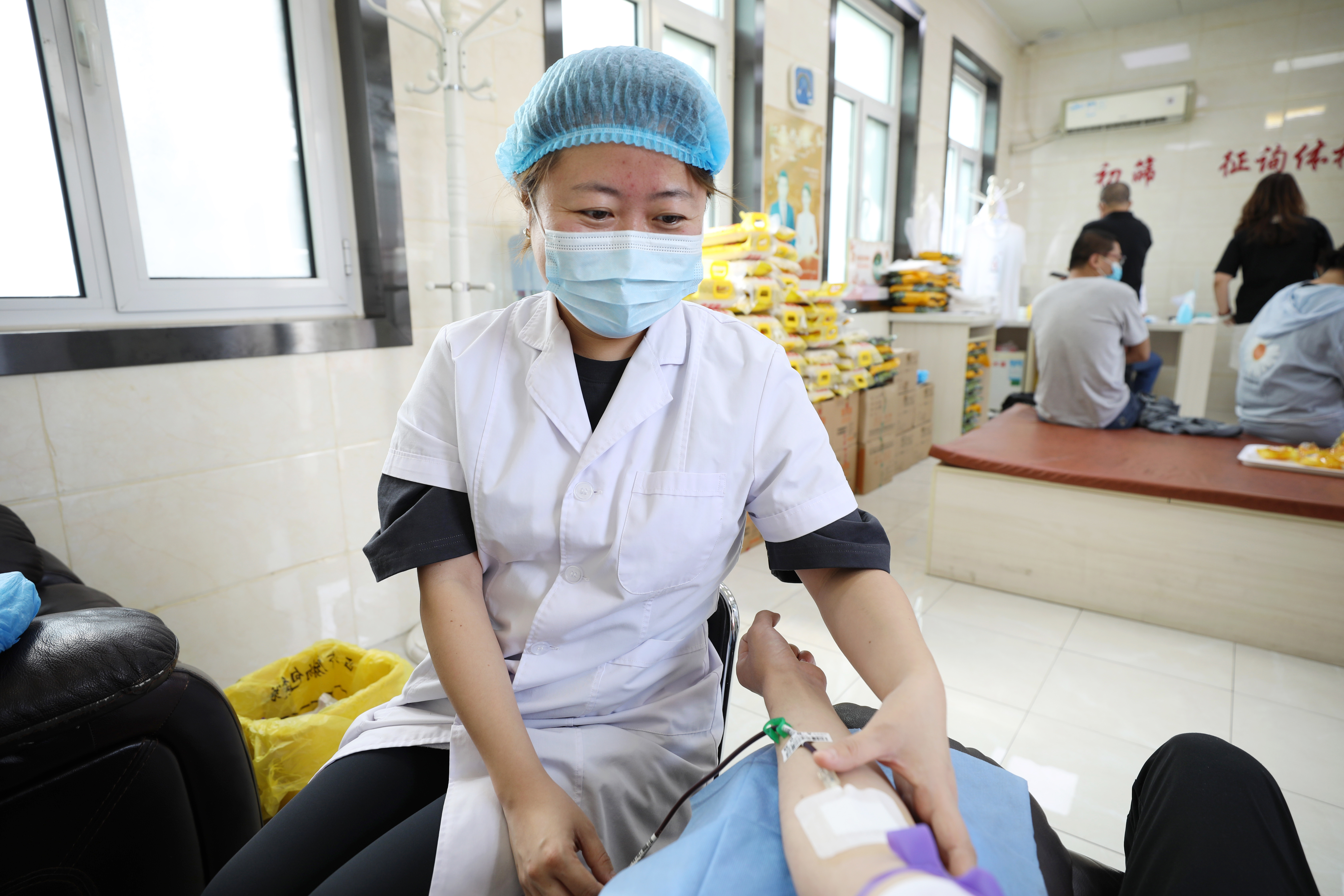 献血屋工作人员正在为献血人员采血。