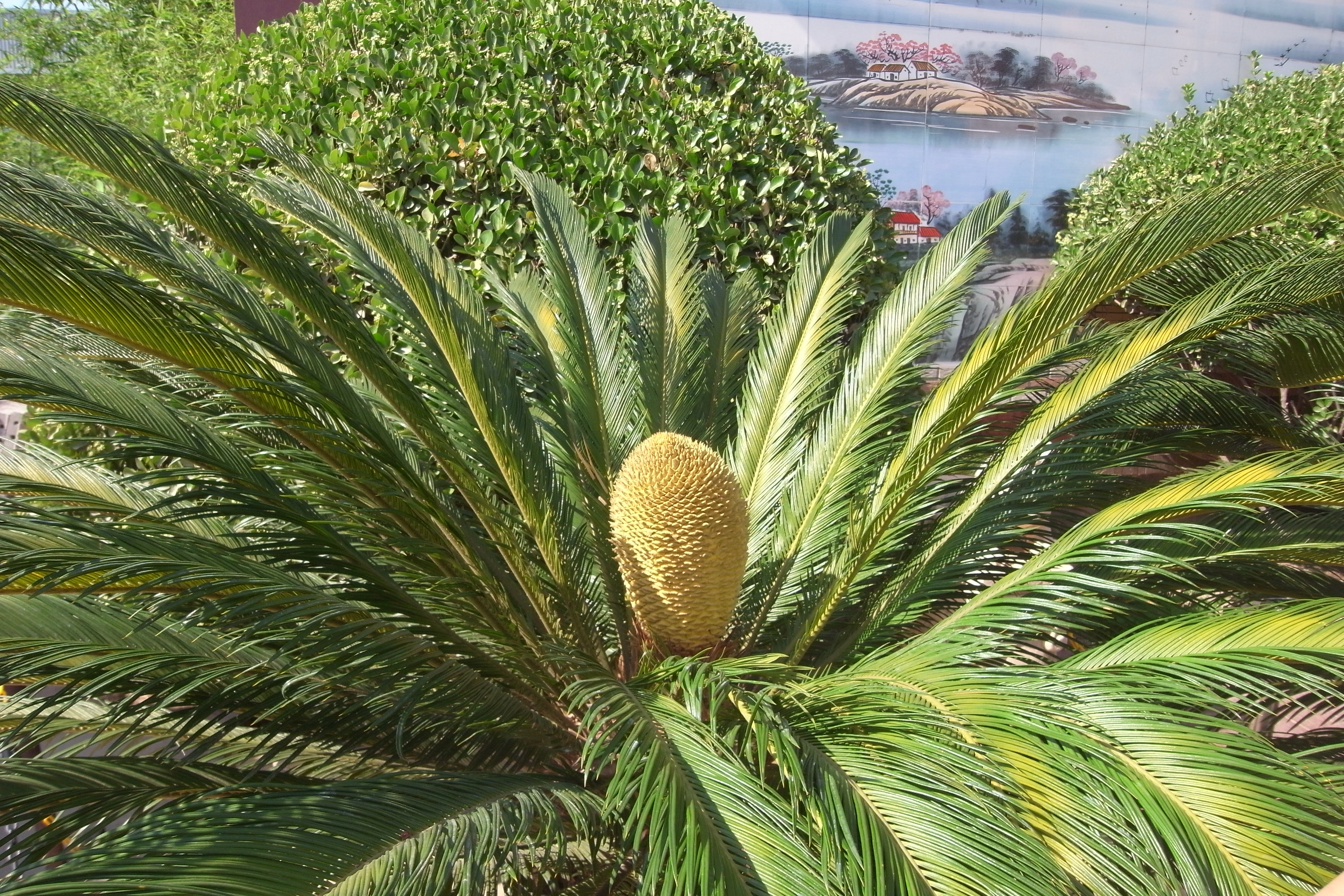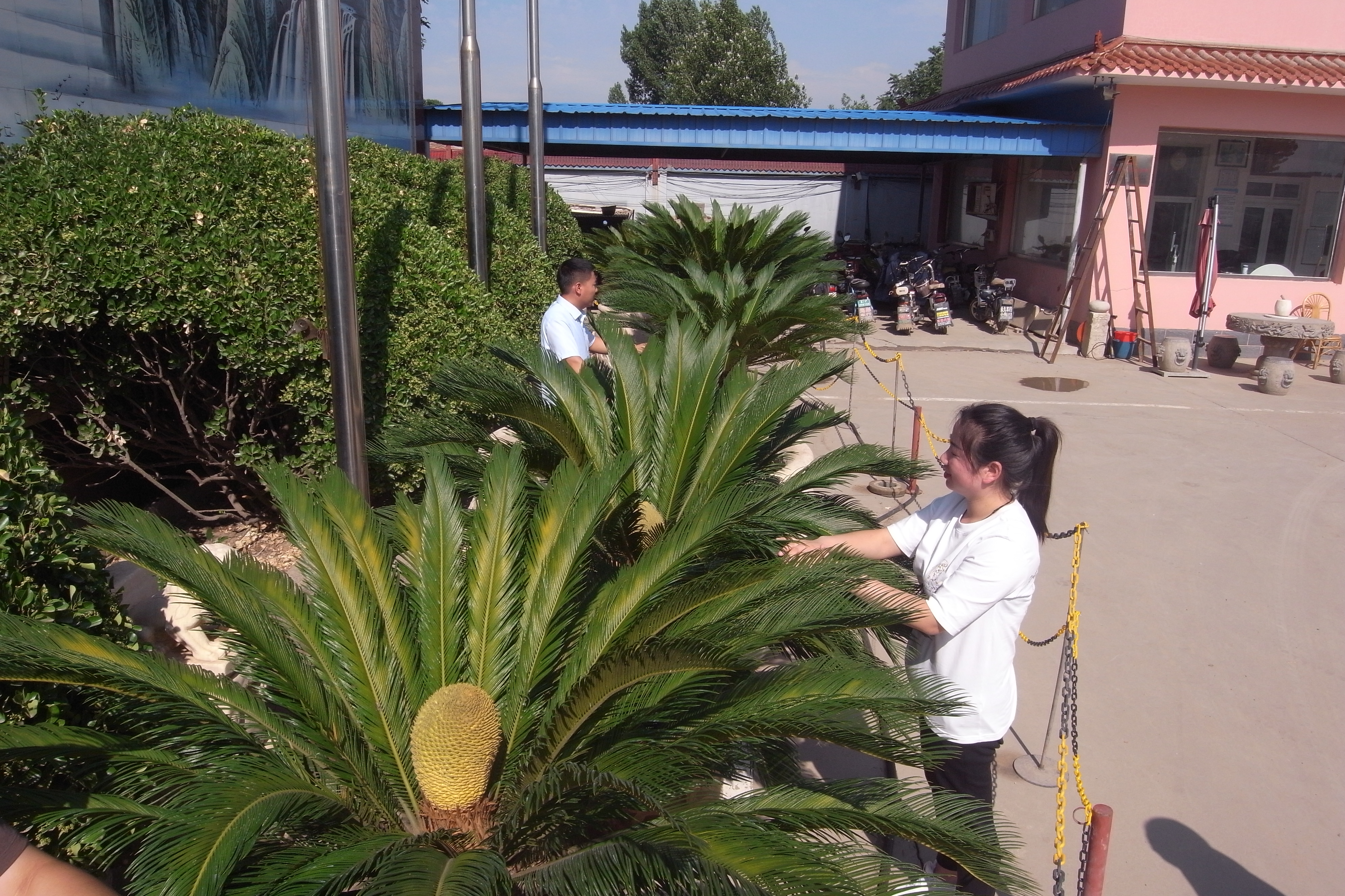 在润旺达干净整洁的院落内,笔者发现,6株高大、葱绿、旺盛的铁树“站”成一排,各自的花芯处相继长出了金黄色的硕大花蕾,雄花呈圆锥形,高大挺拔;雌花相对矮很多,呈半球形,都有着独特的仪态,甚是壮观、好看,微风一吹,还散发出淡淡的清香,向人们展现着生命的蓬勃与美丽。