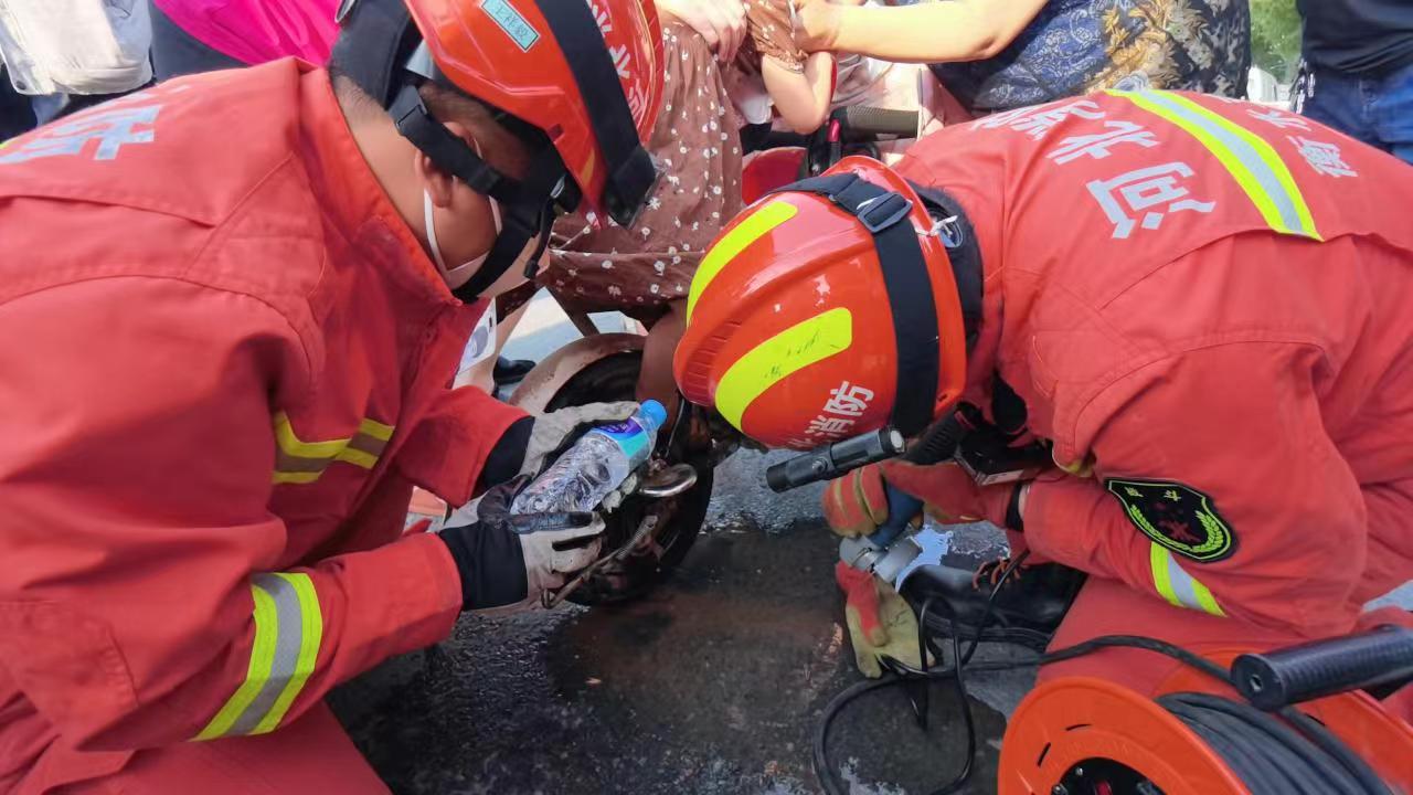 消防救援人员赶到现场后发现,1名4岁小女孩右脚被卡在电动车后轮轮毂内,脚踝处扭曲红肿。情况紧急,救援人员首先叮嘱家长护住小女孩头部稳定其情绪,随后利用角磨机对电动车进行破拆。为防止小女孩因角磨机过热烫伤,指战员用凉水在一旁不断对破拆部位进行冷却,经过5分钟的紧张救援,小女孩右脚被成功取出并移交现场医护人员救治。