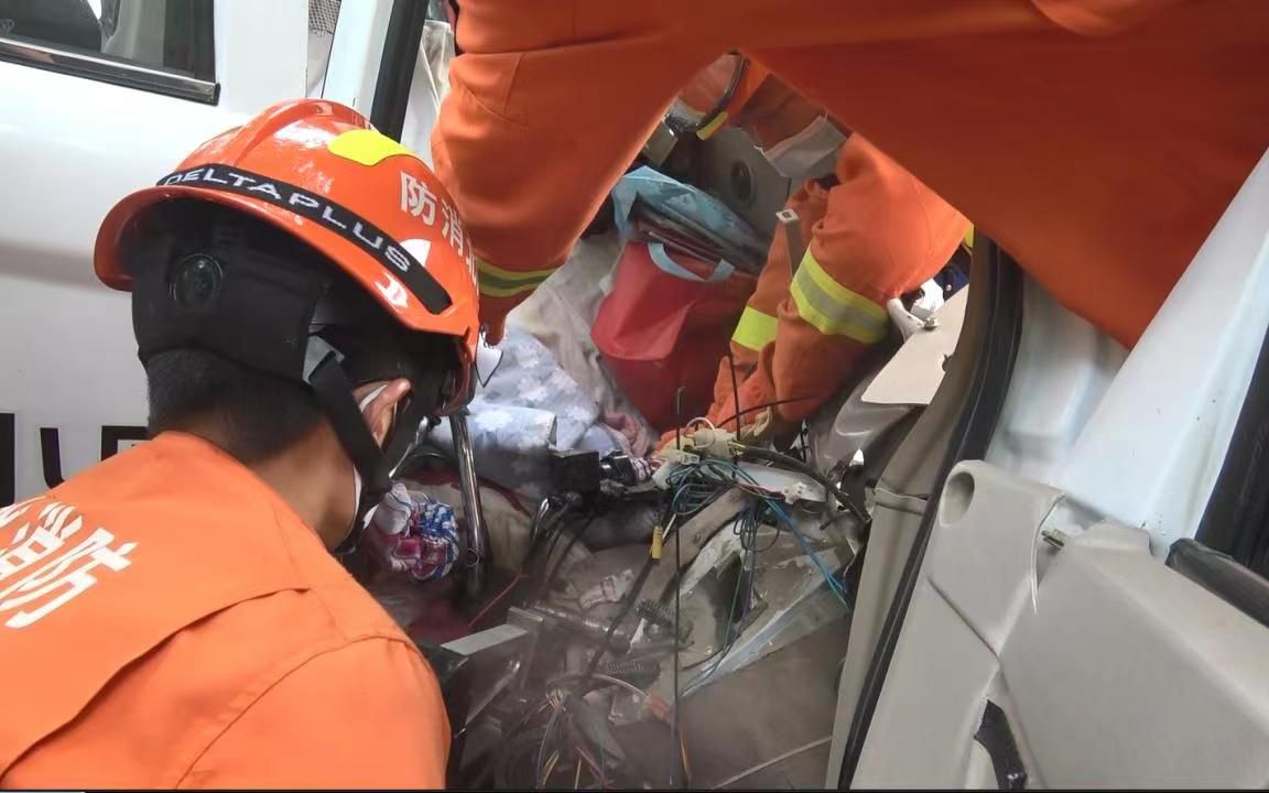 消防救援人员到达现场后,侦查发现事故造成电动三轮车车体严重变形,车主双腿被紧紧卡在里面,右脚断裂,情况十分紧急。