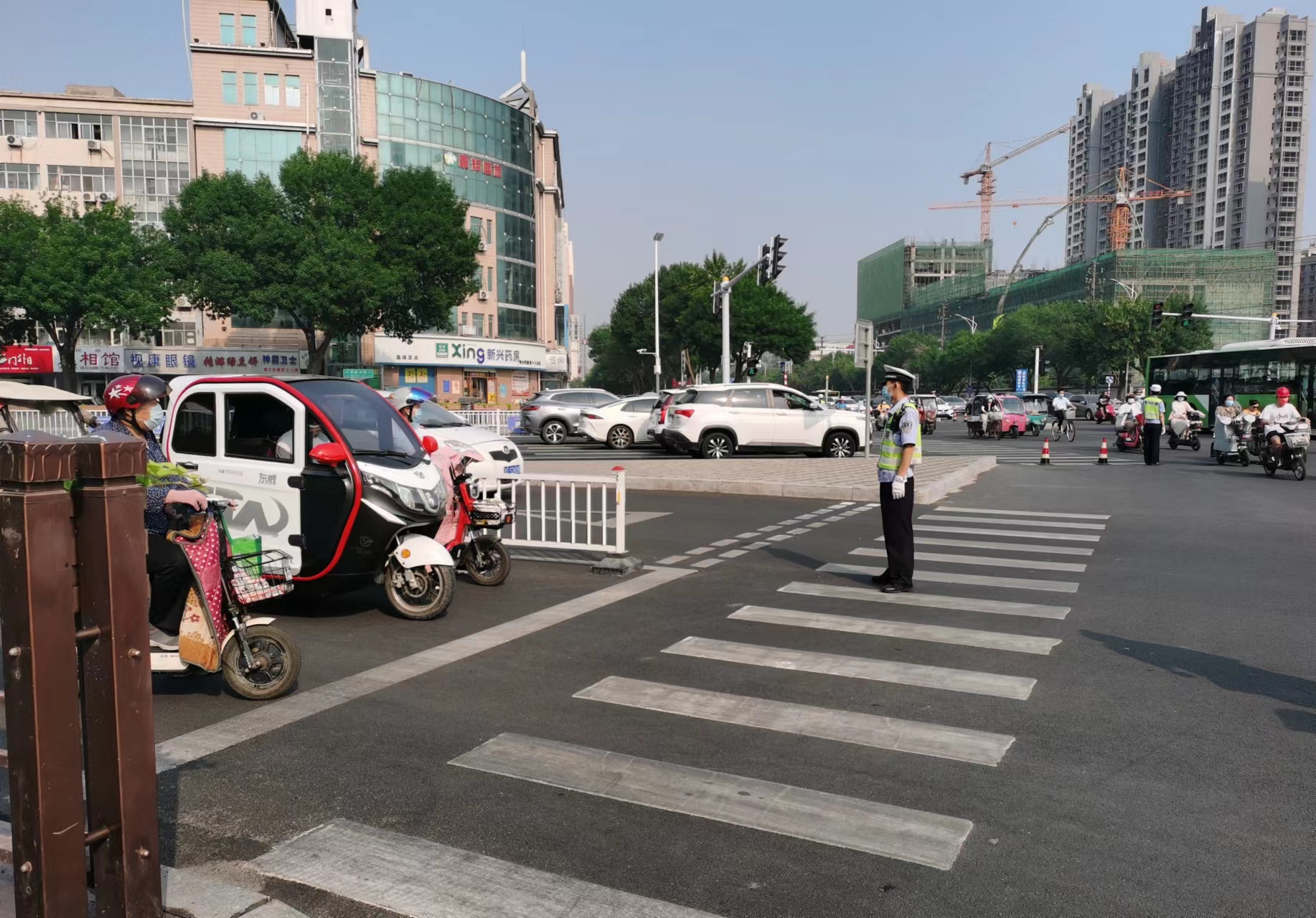 在永兴路与育才大街口,软硬件交通设施比较完备,右拐机动车都能按照标识,自觉为直行的非机动车和行人让行。非机动车也比较守规矩,都能按照信号灯和交警引导正确通行。偶尔有个别非机动车主存在不文明行为,会被执勤交警及时劝阻。“谢谢你交警同志,我下次一定注意!”采访中,一位骑电动车的市民正欲斜穿通过路口时被交警拦了下来,在了解到这种渠化路口不能斜穿,必须二次过街时,他向交警表示了感谢,并按交警指引路线安全有序通过路口。