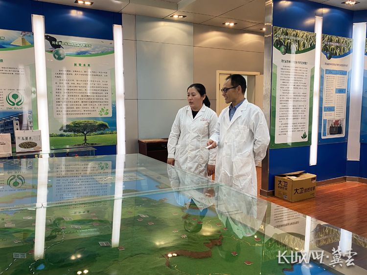 李顺国(右)讲解河北省谷子主产区地图。长城网·冀云客户端记者 李元华 摄