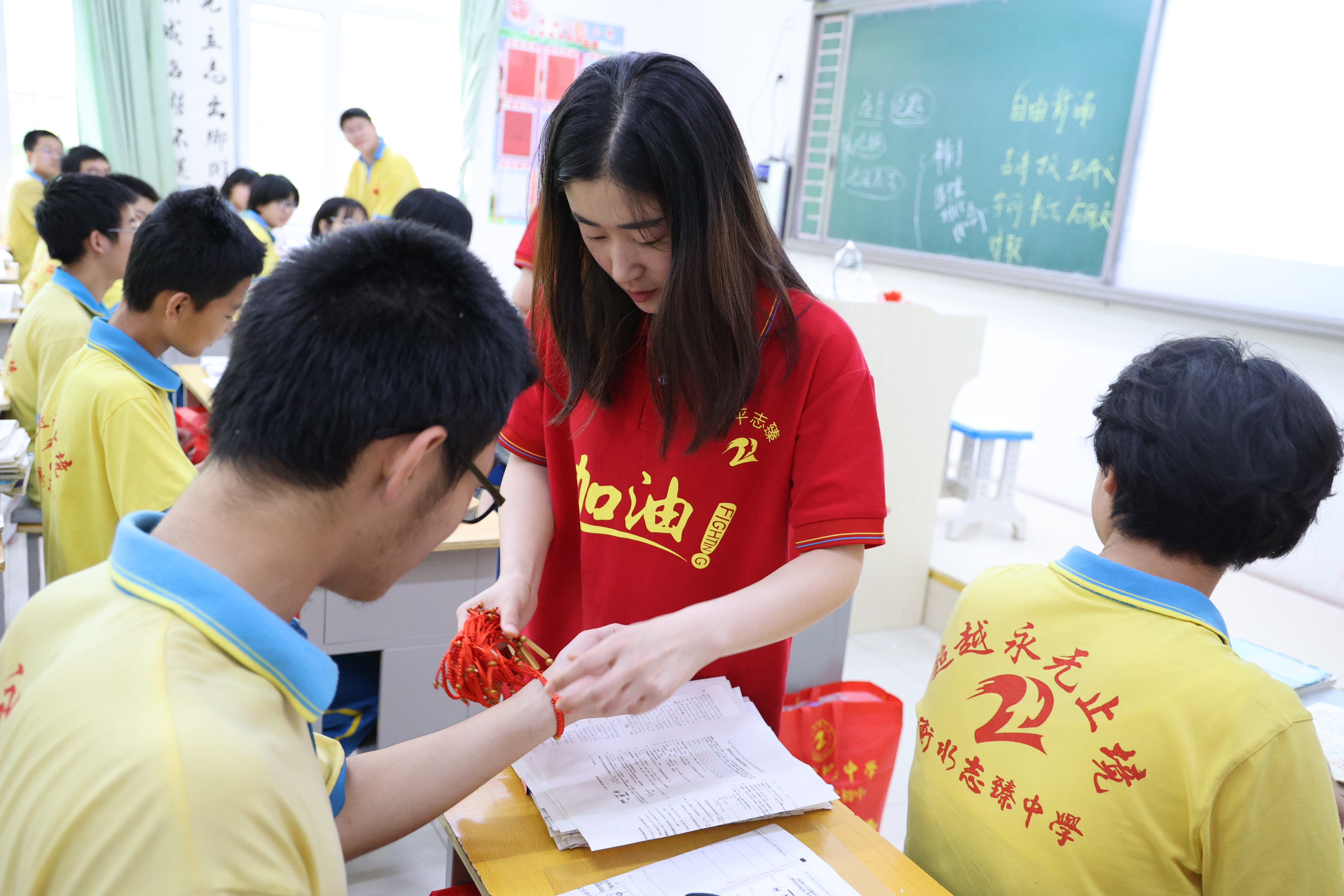 6月14日,衡水安平志臻学校初三年级老师们身着红色战袍,为同学们送上精心准备的班级吉祥物:“锦鲤”寓意“鱼跃龙门,顺顺利利”,“帆船”寓意“一帆风顺”,“雄鹰”寓意“展翅翱翔”……各式各样的班级吉祥物承载着老师对初三学子们的温馨祝福与殷殷期盼。同时,老师们还向同学们送上自己的美好祝愿,“三年问道,焚膏继晷,必将金榜题名”“纵横逸气宁称力,驰骋长途定出群”声声寄语缓解了学生们的压力,激励每一位初三学子勇往直前。