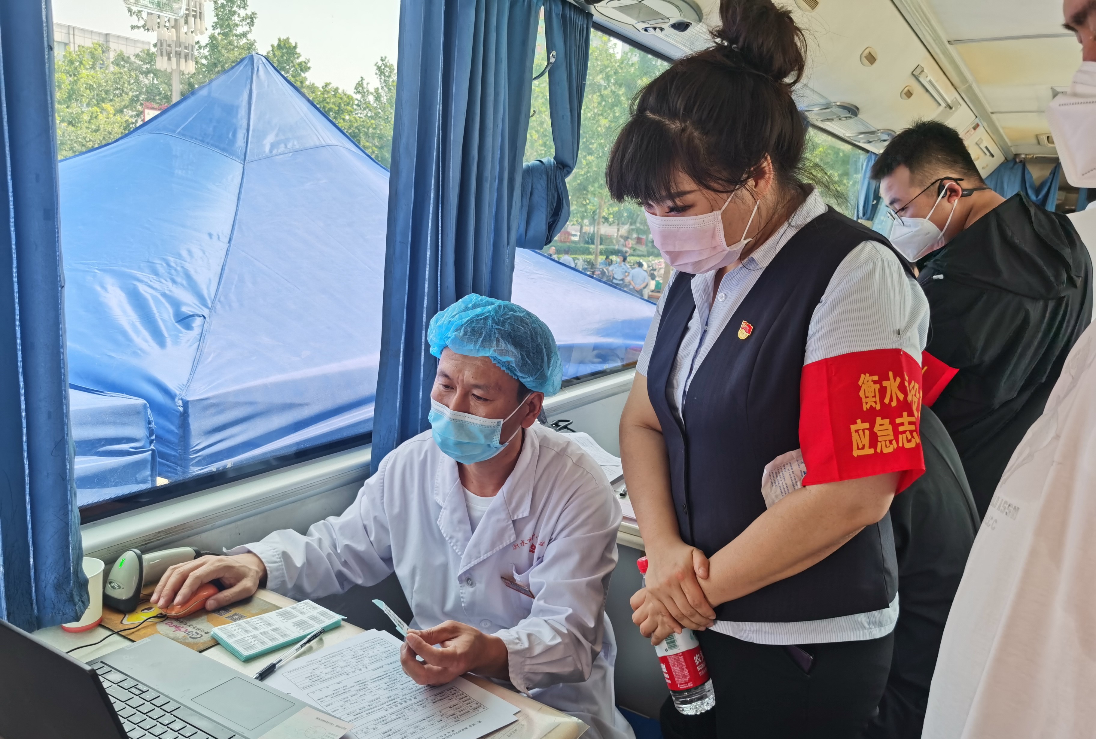 高温炙烤下的献血车“轰轰”地工作着,像一头嘶吼的老牛。当日上午,来自衡水退役军人应急志愿先锋队和衡水忠义饮食公司的爱心人士,冒着高温,在献血车前排起了长队。填表、体检、测血型、采集……市中心血站工作人员的脸上挂着汗珠,但整个献血流程纹丝不乱,他们工作起来有条不紊。
