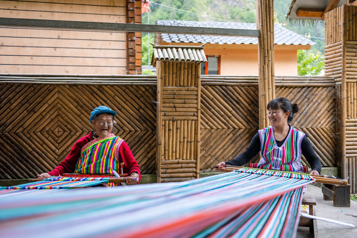 在云南省贡山独龙族怒族自治县独龙江乡迪政当村,独龙族老人李文仕(左)和女儿在编织独龙毯(5月10日摄)。新华社记者 曹梦瑶 摄