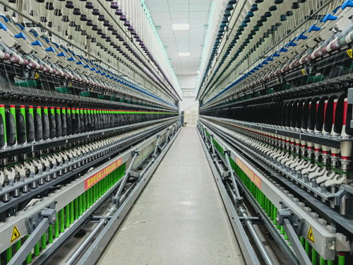 ↑图为沧州市东光县纺织企业智能化纺纱车间