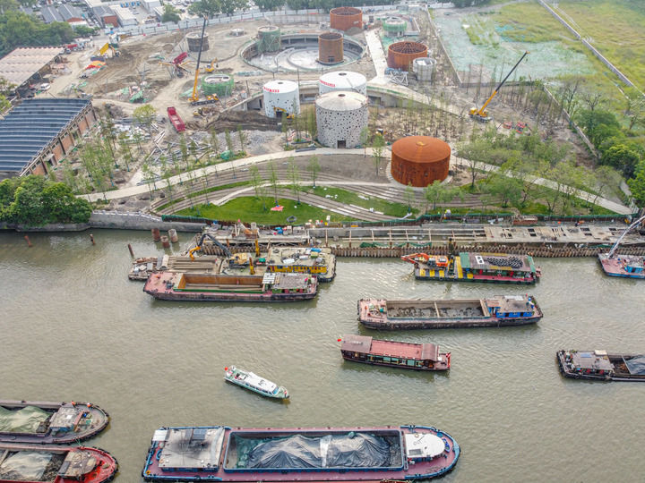 这是5月27日在浙江省杭州市拍摄的建设中的小河公园,该公园由一处工业遗存小河油库改造而成(无人机照片)。新华社记者 江汉 摄