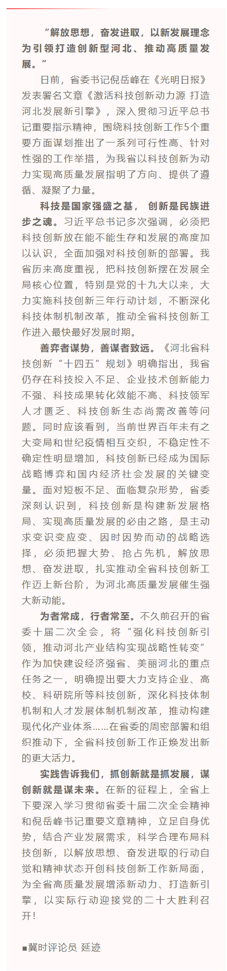 来源:冀时客户端 点赞 +1 微博 微信 我要评论 发布 相关推荐 冀时评丨向改革创新要动力 开启雄安发展新篇章 关注 1天前 冀时评丨锚定初心 做好承接疏解大文章 关注 4天前 冀时评丨筑新时代创新高地 立高质量发展样板 关注 5天前 冀时评丨从“不临海”到“通四海” 雄安以制度创新打造内陆开放新样本 关注 6天前 冀时评丨赛事经济“热辣滚烫”,河北凭什么“吸粉”又“吸金”? 关注 03-24 冀时评丨从开年成绩单看燕赵涌春潮 关注 03-22 冀时评丨从开年成绩单看燕赵涌春潮 关注 03-22 冀时评丨一场场“双向奔赴”,让“春风行动”更有温度 关注 03-19 冀时评丨一颗“定心丸”激发创新“加速度” 关注 03-18 热门 一天 三天 一周 1 【新闻发布】衡水市发布2026年消费品以旧换新政策 持续释放消费潜力 2 衡水安平:金色花海醉春风 油菜花海迎来盛花期 3 衡水积极构建信用服务链条 以信用建设“小切口”优化营商“软环境” 4 清明假期衡水车务段加开18列临客 5 河北衡水:樱花岛春日盛景引客来 6 人勤春光好 沃野绘“丰”景 ——衡水市各地抢抓农时做好春耕春管 7 推动区域康复医疗高质量发展——衡水国承中西医结合医院加入省级康复医联体 8 衡水工伤知识小课堂‖新业态从业人员享受职业伤害保障待遇后,能否获赔商业意外伤害保险? 9 桃城区举办“盛世雅韵 戏聚一堂”京剧演唱会 10 跟着网红游武邑 网络达人打卡武邑文旅新地标 用镜头解锁武邑魅力 1 【“十五五”开局看衡水】破局引领破圈 共享实现共赢 ——探访河北冀尚医疗器械有限公司智能化共享喷涂车间 2 河北衡水:春染衡水湖 游人乐享生态好风光 3 衡水市举办助力孤独症儿童健康成长主题宣传活动 4 【新闻发布】衡水市发布2026年消费品以旧换新政策 持续释放消费潜力 5 守护外卖安全 衡水发布七条网络餐饮食安倡议 6 金融镜鉴|因不按约定赔付等原因,阳光财险多家分支机构合计被罚超百万 7 去年京津冀技术合同成交额1.4万亿元 8 中国工艺美术大师张汝财两套内画精品亮相中国美术馆 9 枣强县:“小公约”推动移风易俗 文明新风融入社区治理 10 衡水携手沧州德州筑牢网络餐饮跨区域安全防线 1 微改革激发新活力 微创新助力大发展——衡水市扎实推进改革创新工作走深走实 2 “创赢未来”2026创业大赛衡水选拔赛开始报名了 3 把优质服务送到企业心坎上 ——枣强县打造近悦远来营商环境 4 衡水市完成全省首个公共数据产品交易 公共数据收益缴入国库 5 源清流清 向上向善 6 【新闻发布】 创新招商促落地 深化服务提质效 衡水市持续打造投资兴业热土 7 全国学雷锋活动示范点衡水公交18路队:服务不是喊口号,是把乘客没想到的提前想到 8 衡水发布27个重点招商产业 聚焦县域特色精准发力 9 【乡村行 看振兴】科技种出“新花样”——探访桃城区衡水国际设施园艺产业园 10 承德多领域消费持续升温让春天的“颜值”变“产值” 广告 广告 广告 24小时 1 习言道丨习近平种下过哪些树? 2 近闻·这件利国利民的大事,总书记要求扎实做好 3 海报系列||早安衡水 4 衡水安平:共享智造 激活丝网产业新动能 5 衡水阜城:科技创新引领 汽车灯具产业高质量发展 6 河北衡水:雄商高铁衡水南站建设进行中 7 衡水冀州:智能育苗工厂 科技赋能保春耕 8 河北衡水:打造15分钟学习圈 点亮银龄精神家园 9 衡水阜城:高效节水润良田 科学春管助丰收 10 河北衡水:河西驿家人,服务零距离