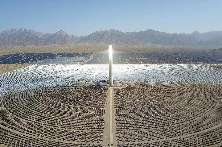 这是2022年6月8日在青海省海西蒙古族藏族自治州德令哈市光伏(光热)产业园拍摄的青海中控德令哈50兆瓦光热电站(无人机照片)。新华社记者 范培珅 摄