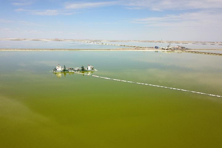 这是2022年6月13日在青海柴达木盆地拍摄的察尔汗盐湖上的采盐船(无人机照片)。新华社记者 范培珅 摄