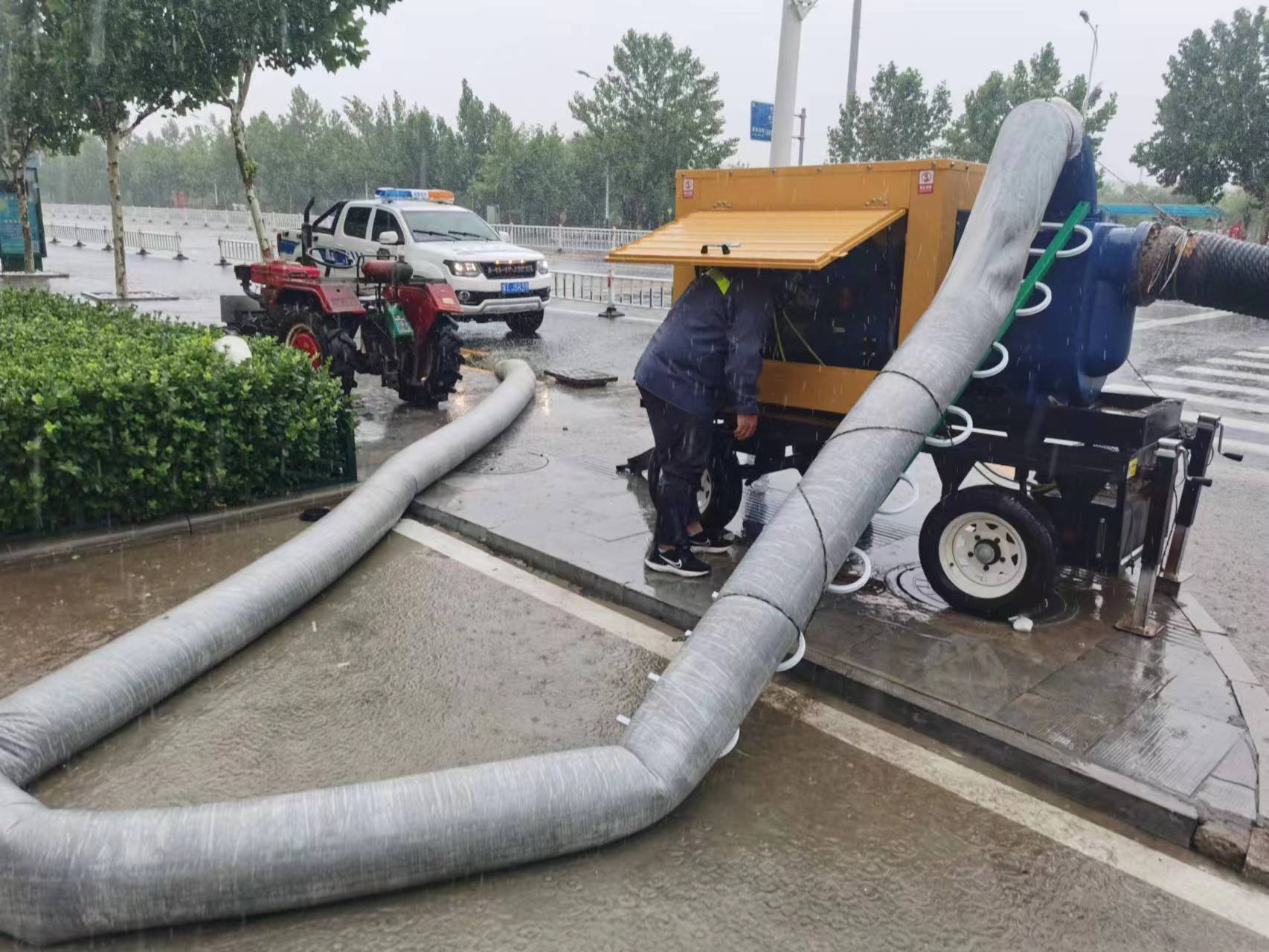 工作人员组织排水排涝。孙丹凤 摄
