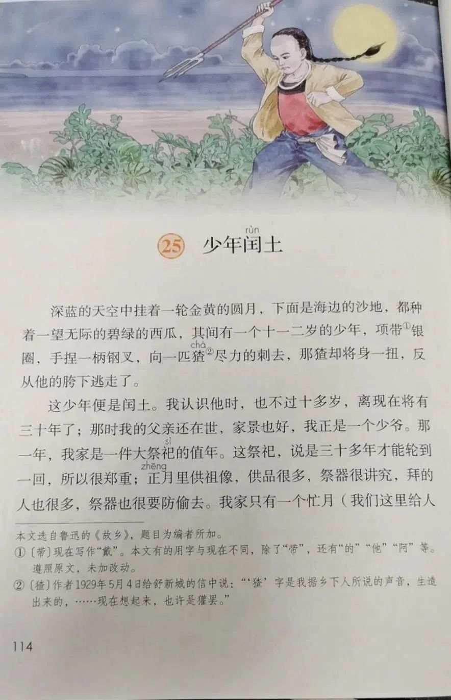 节选自鲁迅小说《故乡》的《少年闰土》,被历套教材选入,是小学生最熟悉的鲁迅作品。图/小学语文六年级上册