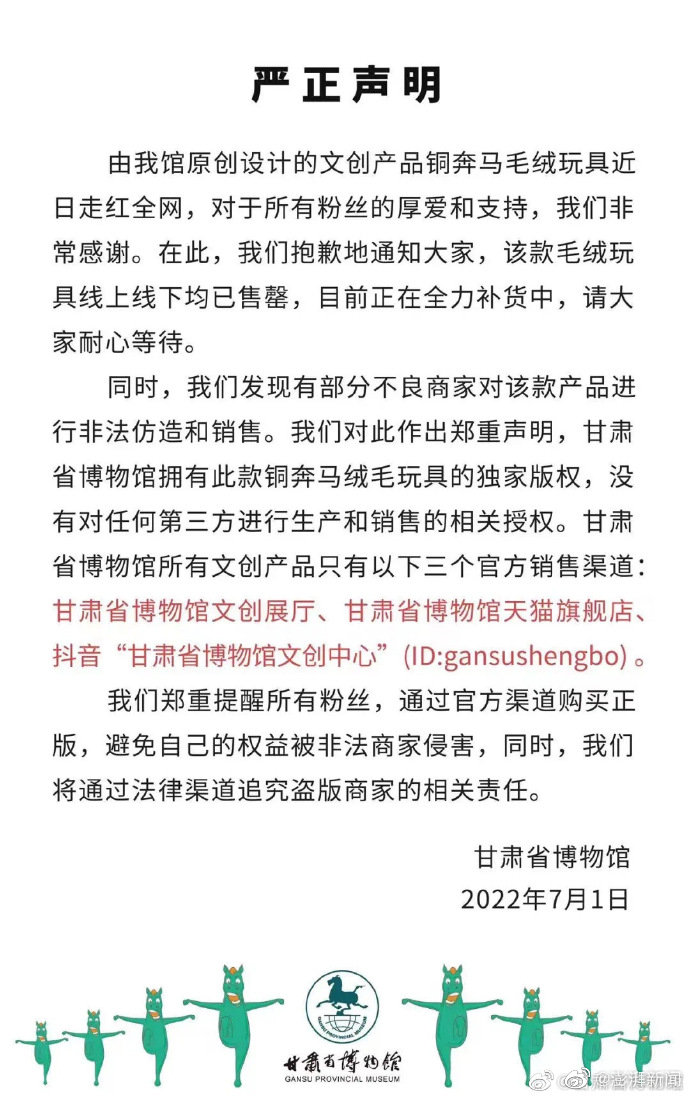 日前,甘肃省博物馆推出的一款“马踏飞燕”毛绒玩具因其丑萌“出圈”,受到网友热捧。但与此同时,该文创产品也遭遇“李鬼”。7月1日晚,甘肃省博物馆官方微博刊发声明称,由甘肃省博物馆原创设计的文创产品铜奔马毛绒玩具近日走红全网,该毛绒玩具线上线下均已售罄,目前正在全力补货中,请大家耐心等待。声明指出,甘肃省博物馆发现有部分不良商家对该款产品进行非法仿造和销售。对此,甘肃省博物馆方面强调拥有此款铜奔马毛绒玩具的独家版权,并且没有对任何第三方进行生产和销售的相关授权。