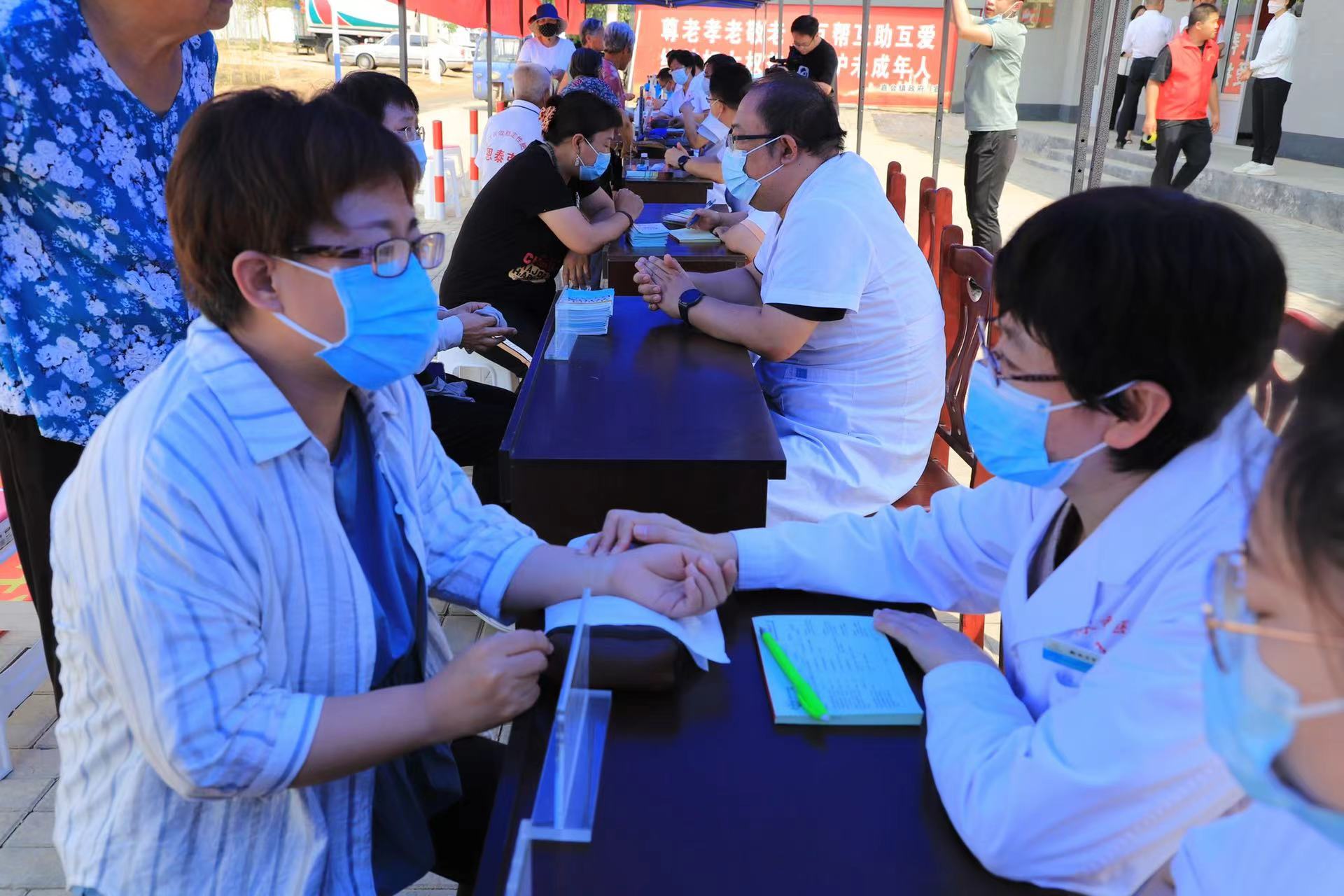 7月1日下午2时30分许,前来看病的村民早早来到义诊大棚前,生怕错过了这次机会。“您哪里不舒服,我看一下您的舌苔!”在义诊桌前,市中医医院18位中医“大咖”通过望闻问切的方式,为前来看病的村民诊疗。记者了解到,此次义诊活动的通知下发到嘉会镇各村后,需要看病的村民纷纷在村干部的带领下来到义诊现场,在志愿者的引导下,有序排队等候看病。一些腿脚不便的村民,被家人用三轮车载着来到现场。市中医医院的专家们为前来问诊的村民一一答疑解惑,免费进行血压、血糖测量,心电图、B超检查,还对患有高血压、糖尿病、关节炎等慢性疾病的村民给予了合理膳食、合理用药、适当运动、科学保健等方面的健康指导。