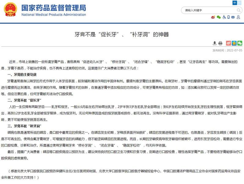 近来,市场上销售的一些所谓牙膏产品,宣称具有“促进幼儿长牙”、“修补牙洞”、“闭合牙缝”、“稳固牙松动”,甚至“让牙齿再生”等功效。需要指出的是,牙膏不是药,不能治疗疾病,也不具有上述宣称的功效。这里提示广大消费者注意以下几点: