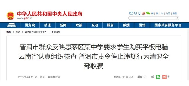 近日,云南省普洱市张先生通过国务院“互联网+督查”平台反映,思茅区第四中学以是否购买平板电脑划分智慧班和传统班。云南省政府接到国办督查室转办的问题线索后,立即组织开展核查。经核查,自2020年秋季学期开始,思茅区第四中学以是否购买平板电脑为依据,将新入学的七年级学生分为智慧班和普通班,要求14个智慧班的719名学生按照5800元/套标准购买平板电脑、配套设备及资源服务。截至督查时,719名学生已每人缴纳3400元(包括平板电脑、配套设备及第一学年资源服务费),收费总额为244.46万元。