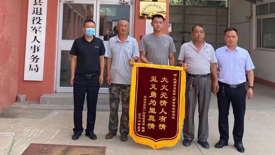近日,衡水市武强县周家窝镇康家厂村村干部将一面写有“大火无情人有情 见义勇为显真情”的锦旗送到武强县退役军人事务局,表扬退役军人吴浩奋力扑救火灾的见义勇为行为。