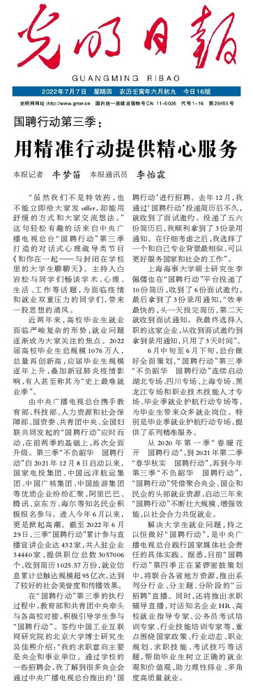 央视网消息:7月7日出版的《光明日报》刊文《国聘行动第三季:用精准行动提供精心服务》。全文如下: