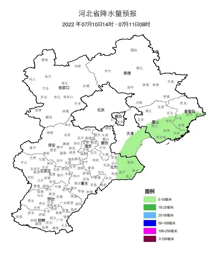 具体天气预报为:7月10日夜间,多云,东北风2~3级,最低气温20~21℃;11日白天,多云转阴有雷阵雨,偏北风2~3级,最高气温29~30℃;11日夜间,阴有中雨,局部大雨,偏北风2级,最低气温22~23℃;12日,阴有中雨,局部大雨,28~24℃;13日,阴有阵雨,局部中雨,转多云,27~22℃;14日,晴,34~23℃;15日,晴,35~24℃;16日,晴间多云,34~25℃。