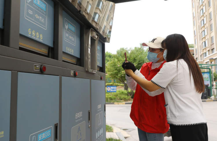 河北省邢台市任泽区环保志愿者在向社区居民讲解智能垃圾分类箱的使用方法。(受访单位供图)