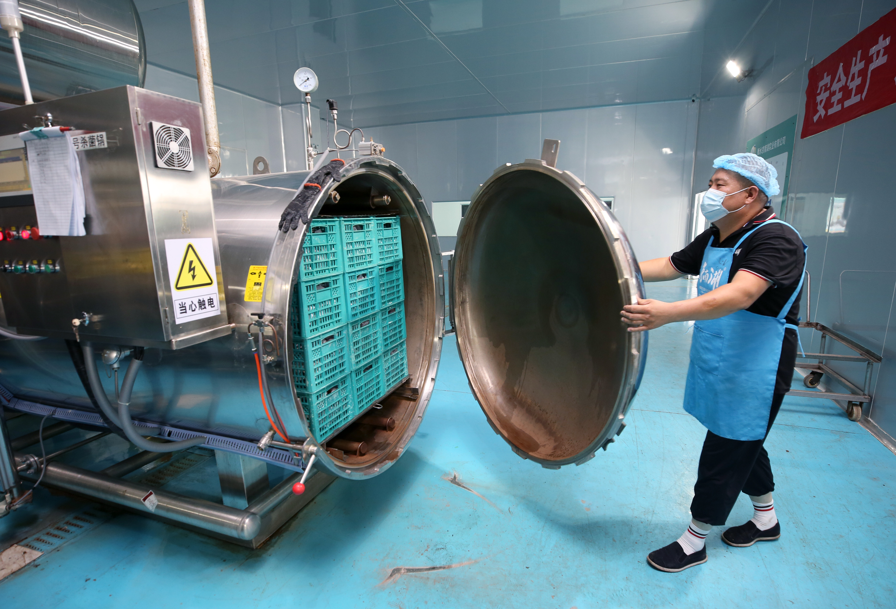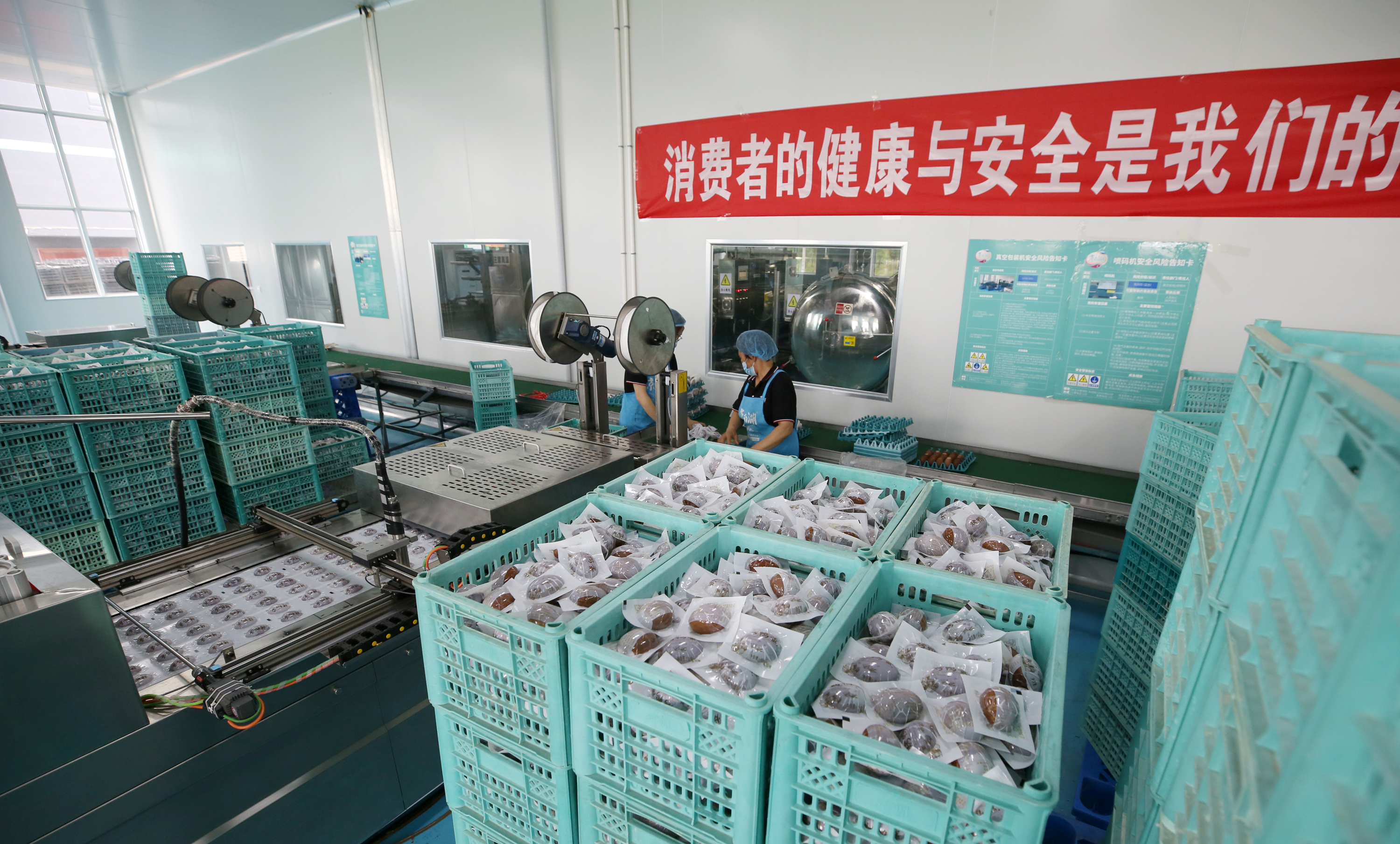 加工车间内,一台台大型现代化自动设备,一道道先进、繁琐、考究的生产工艺,令人啧啧称奇。袁站磊介绍,要烤制出焦香油多、健康美味的鸭蛋,需要经过腌制、清洗、分选、蒸烤、真空包装、灭菌等11道工序。“泥腌鸭蛋需要温度控制在22°C至24°C之间,静置40天左右;在蒸烤锅需进行185分钟特定温度的蒸烤;为了保质期更长,鸭蛋真空包装后还需121°C高温持续杀菌30分钟……”说起工艺,袁站磊滔滔不绝。而这些工艺的完成,离不开成套的先进设备——全自动洗蛋机,每小时可清洗3万枚鸭蛋;裂纹分选检测机,可通过光检、声波测试挑出裂纹蛋,自动称重后根据个头大小放入相应轨道;真空包装机,为鸭蛋进行真空包装……