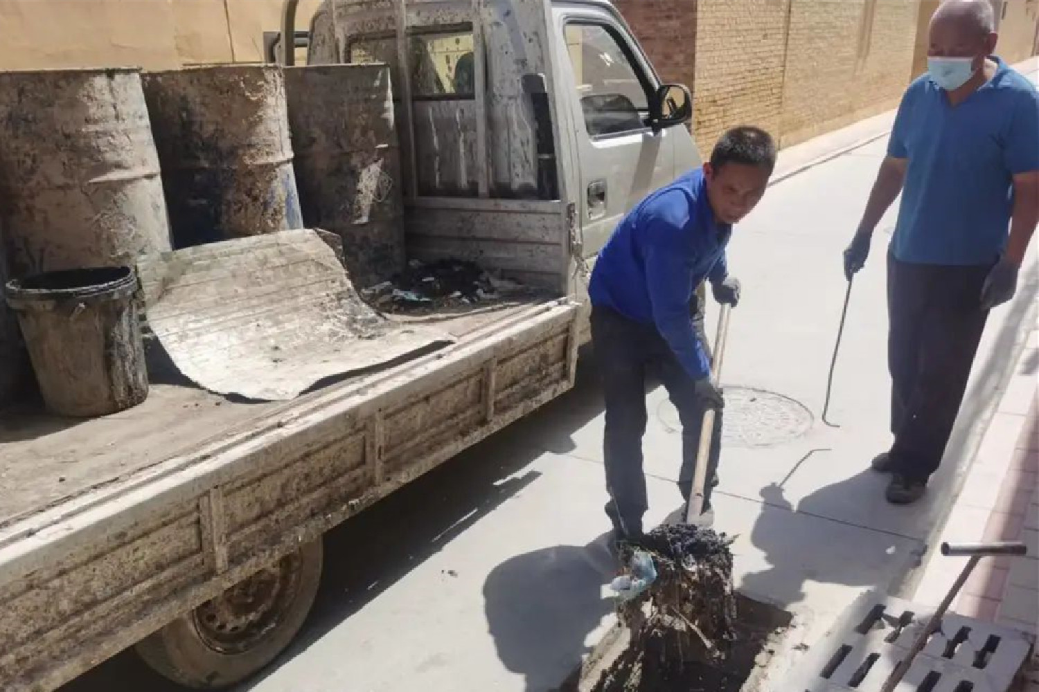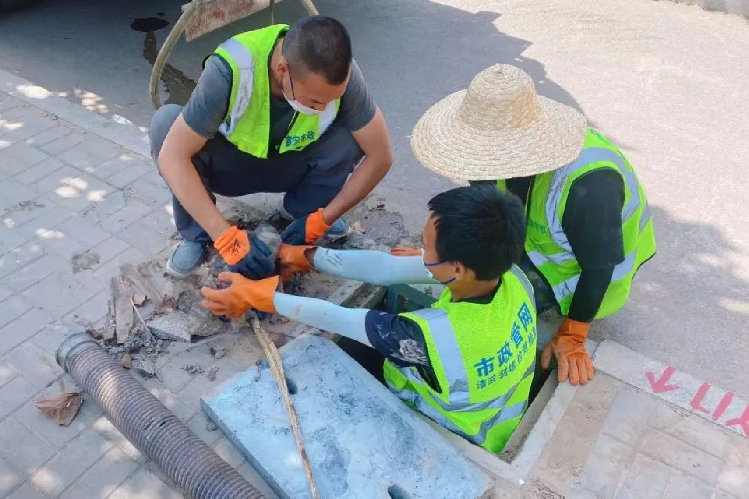 在冀新路,工人们正在清掏雨水篦子。冀州区住建局供图