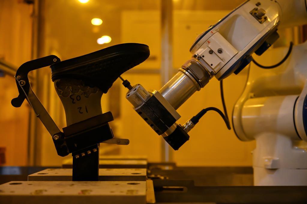 5月12日,在福建省晋江市茂泰鞋材有限公司的智能化生产车间,机械臂在进行花园鞋自动打孔作业。新华社记者 周义 摄