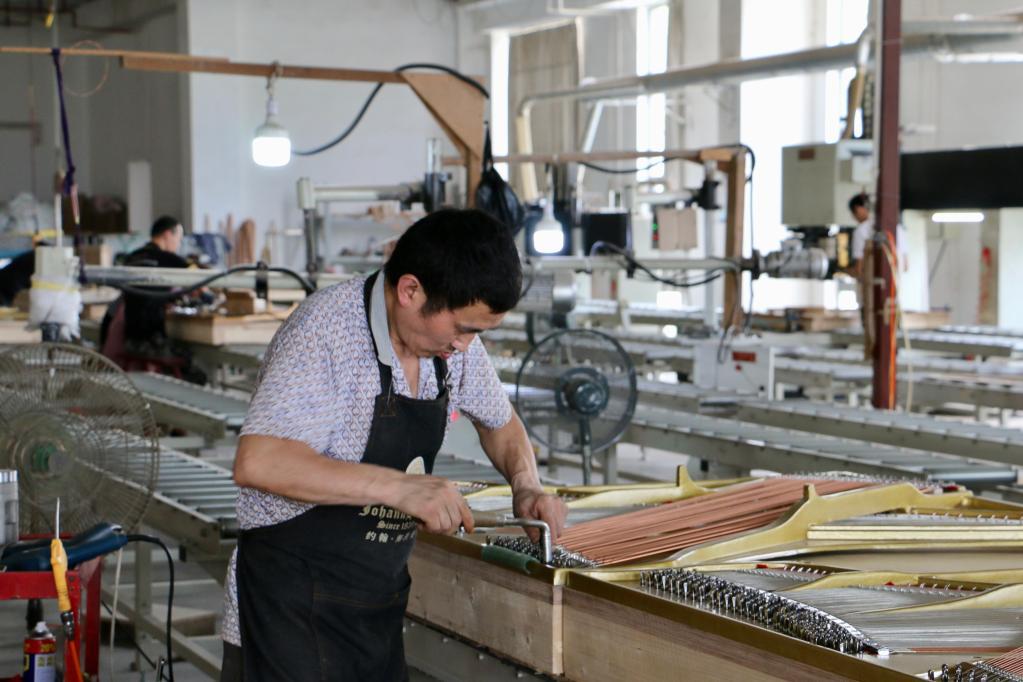 6月21日,东衡村钢琴众创园的工人在为钢琴挂弦。新华社记者 王聿昊 摄