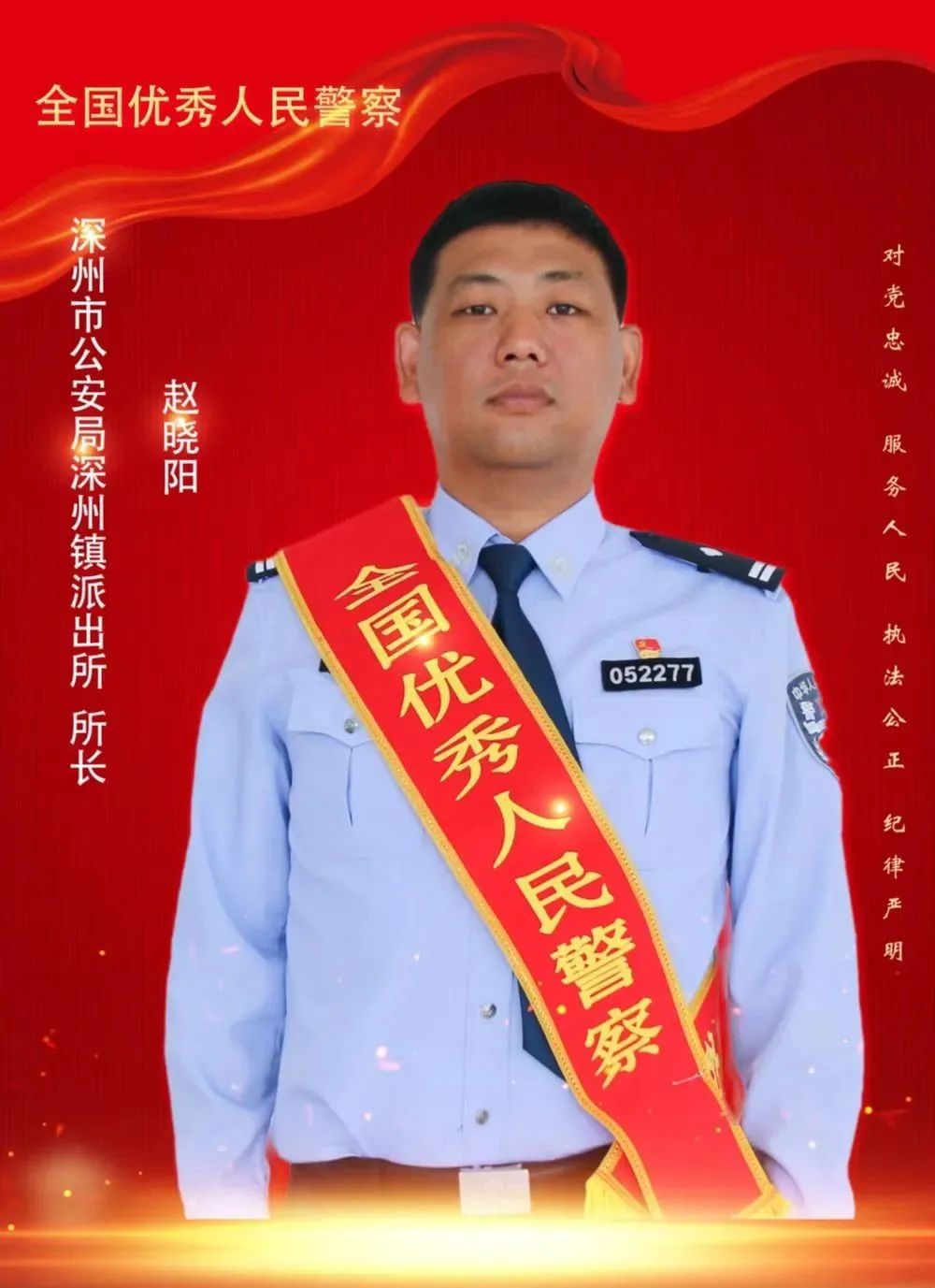 赵晓阳,1986年出生,2008年参加公安工作,历任饶阳县公安局刑警二中队中队长、刑警大队副大队长、城镇派出所所长。2020年7月,赵晓阳作为衡水市首批跨县交流所长到深州市公安局工作,任深州镇政府副镇长、深州镇派出所所长。由于工作成绩突出,赵晓阳同志先后荣获个人三等功一次、嘉奖三次。2022年5月25日,在全国公安系统英雄模范立功集体表彰大会上,赵晓阳同志作为“全国优秀人民警察”受到表彰。