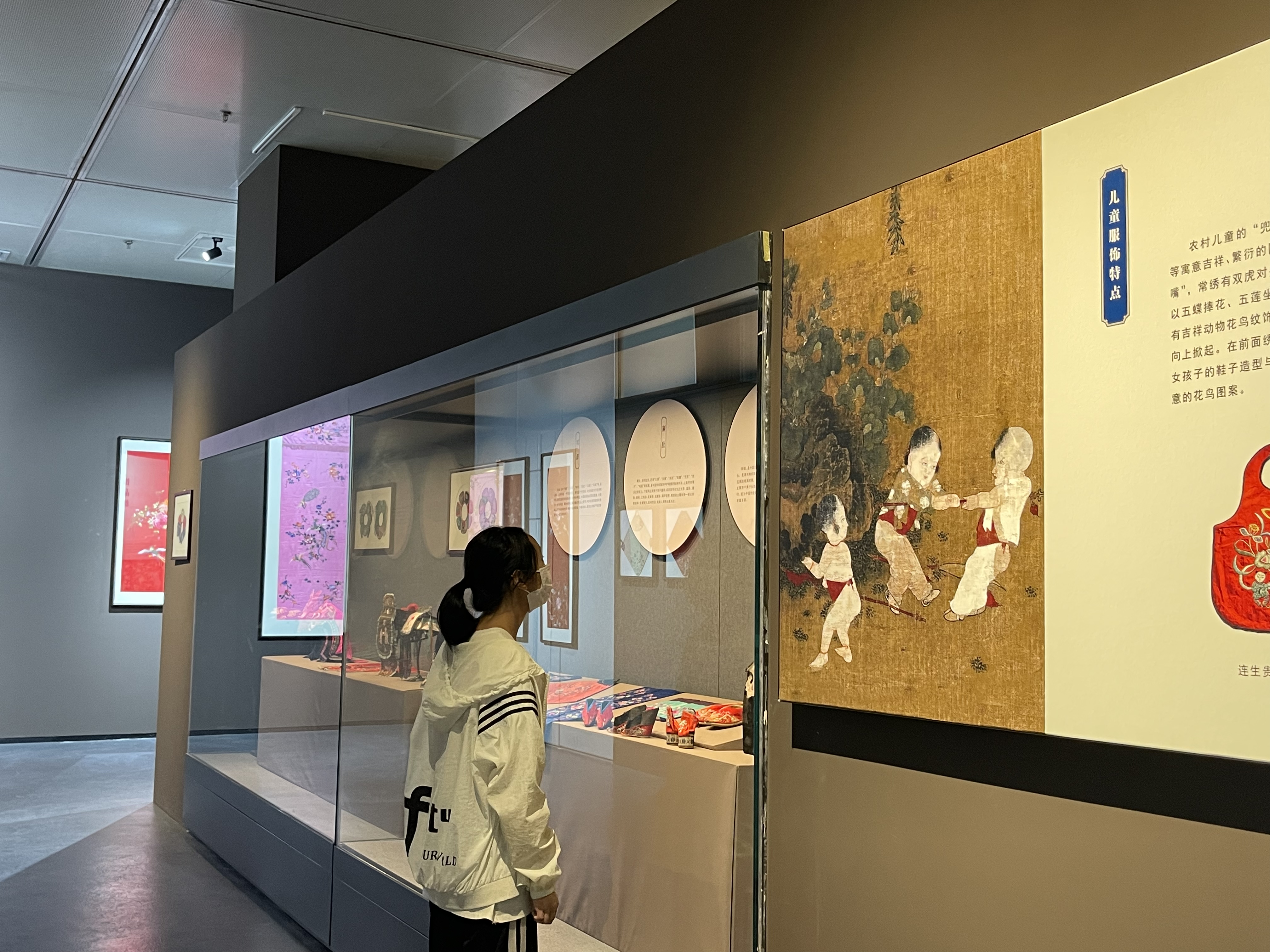 记者在现场看到,许多市民慕名前来观展。独具国风气息的展厅内,一幅幅巨型展板以图文形式讲述着传统刺绣艺术的渊源、种类和特色。展台上、橱窗内,各式各样的民间绣品更是令人目不暇接。旗袍、抹额、云肩、荷包、挽袖、虎头帽等这些近代民间衣物、饰品上,精美的刺绣图案让人大为惊叹。“我第一次看到这么多的枕顶绣,没想到以前的枕头上有这么精美的刺绣图案。从这些花鸟、人物图案上,我可以想象出当时人们刺绣的场景!”一直喜爱刺绣的市民陈女士,看过展览后禁不住赞叹。