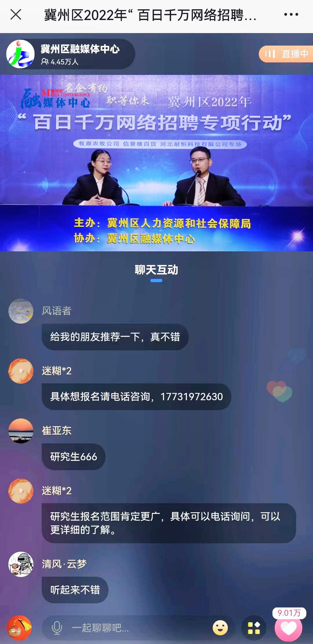 本次直播带岗活动,区融媒体中心推出全媒体联动直播,冀州宣传视频号、掌上冀州app、冀州融媒抖音号、冀州融媒快手号等多平台同时直播,并通过图文、小视频等形式进行前期宣传预热,大大提升了本次直播带岗的覆盖面和影响力。共有16万人次进入直播间观看直播,互动解答各类问题近5000人次。