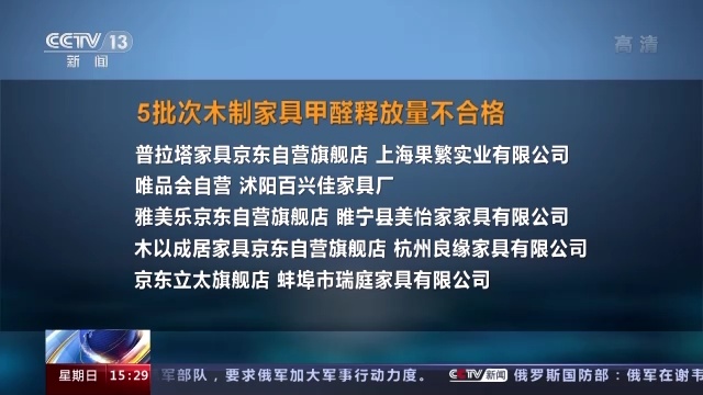 经检测,有5批次网售木制家具甲醛释放量不合格。