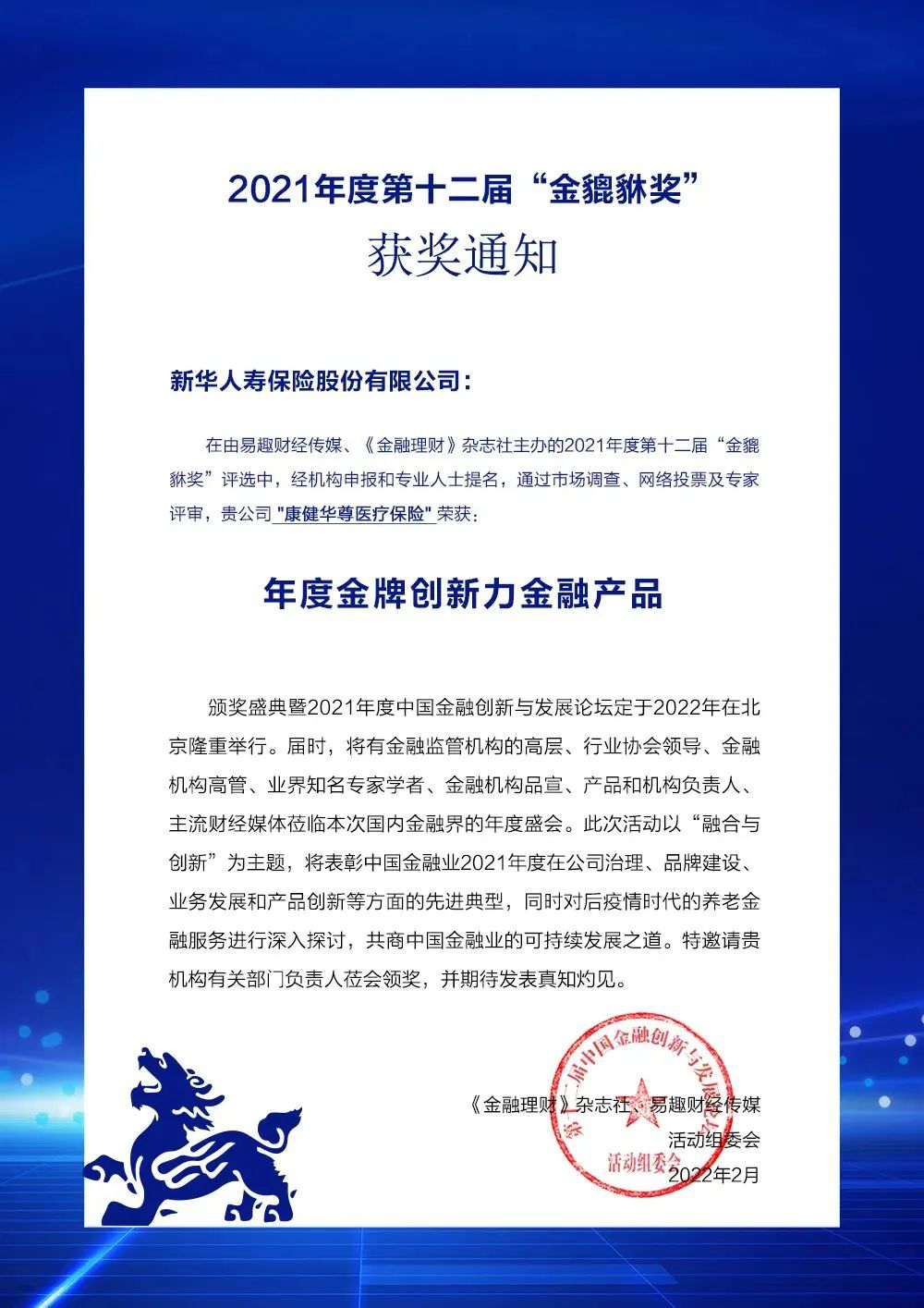 2月,在易趣财经传媒、《金融理财》杂志社主办的第十二届“金貔貅奖”金牌榜上,新华保险康健华贵医疗保险荣获“年度金牌创新力金融产品”奖项。