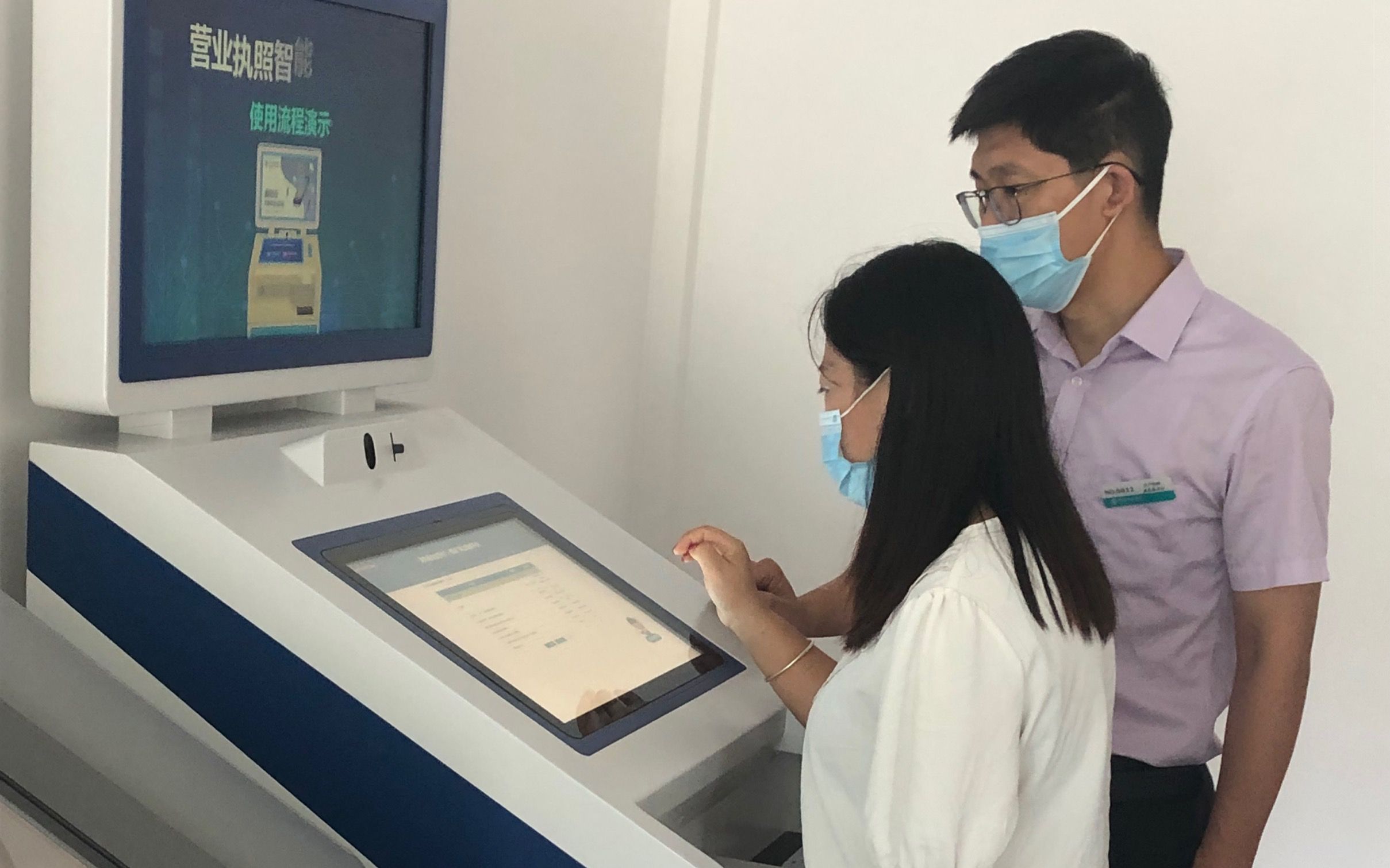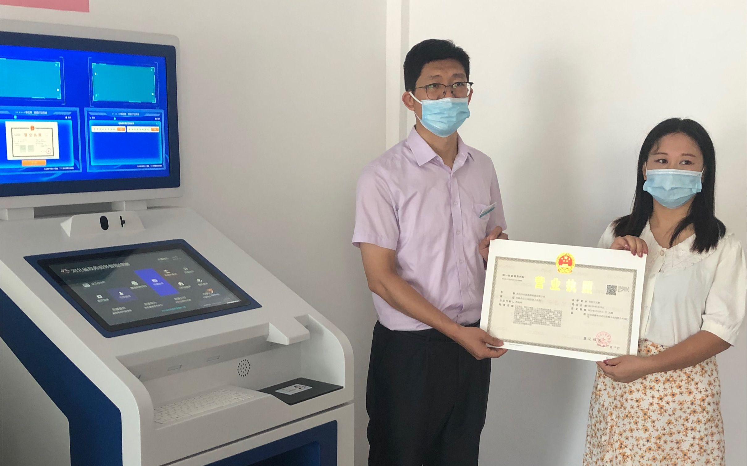 在农业银行武邑县支行内,办事群众正站在河北政务服务智能终端一体机前打印营业执照,打印完毕后,就近在银行的业务窗口直接办理开户业务,不用再去政务服务大厅打印,省时便捷,实现了让数据“多跑路”,群众“少跑腿”。