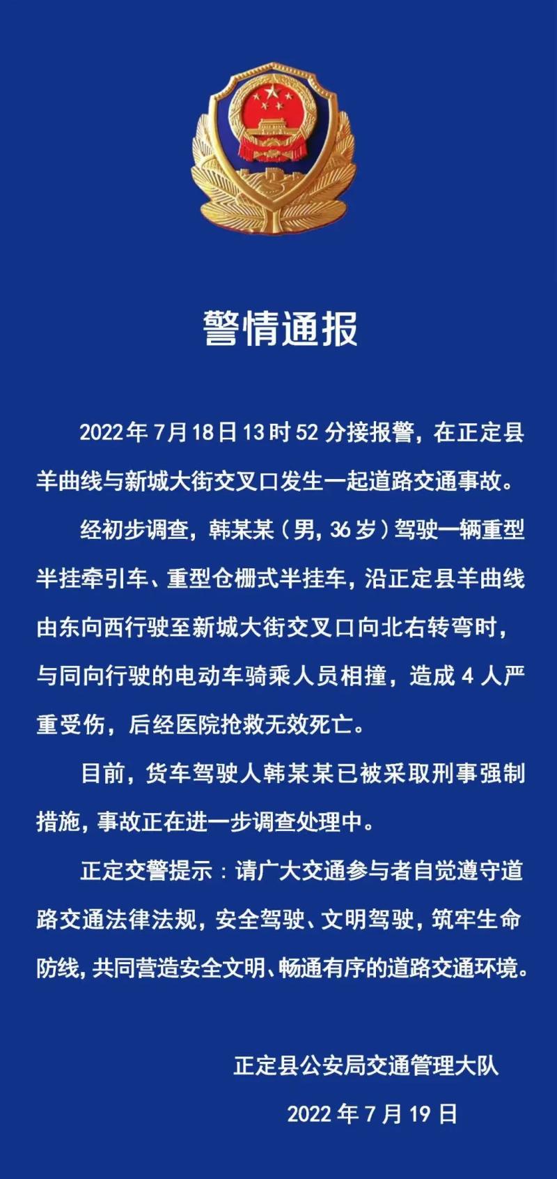 经初步调查,韩某某(男,36岁)驾驶一辆重型半挂牵引车、重型仓栅式半挂车,沿正定县羊曲线由东向西行驶至新城大街交叉口向北右转弯时,与同向行驶的电动车骑乘人员相撞,造成4人严重受伤,后经医院抢救无效死亡。