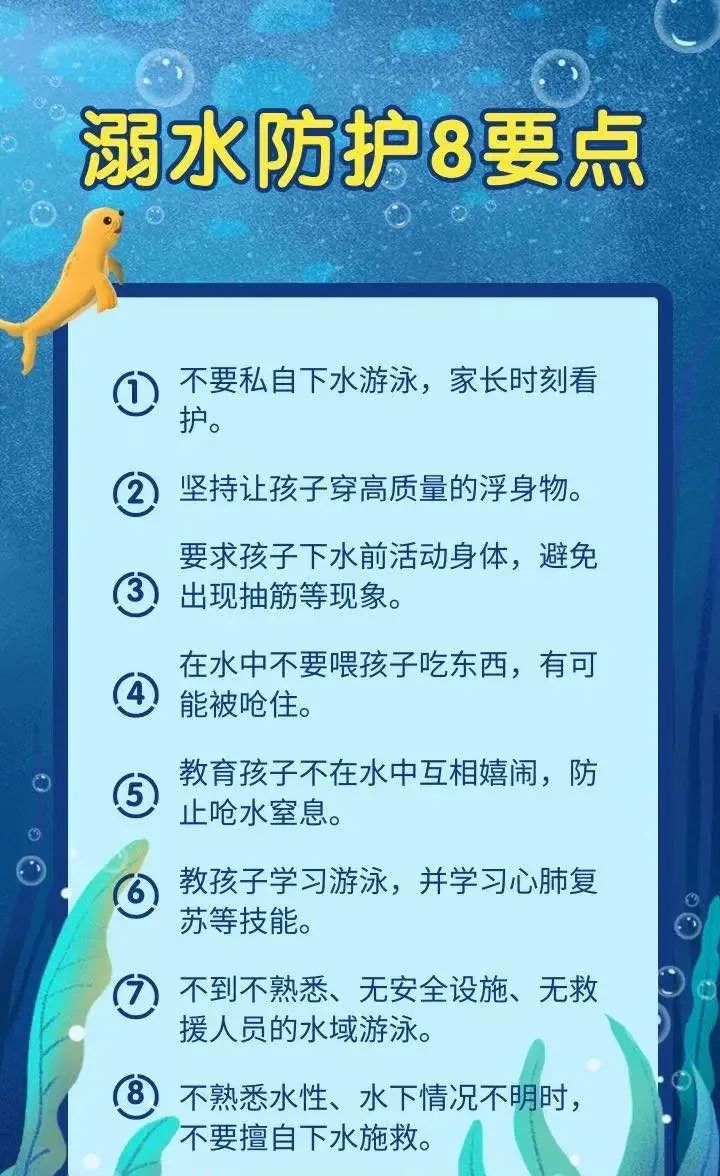 夏季是溺水事故高发期。家长及监护人要增强安全意识和监护意识,加强对孩子进行预防溺水安全教育,对孩子要做到知去向、知同伴、知归时、知内容。防溺水,从牢记这些防溺水知识做起!