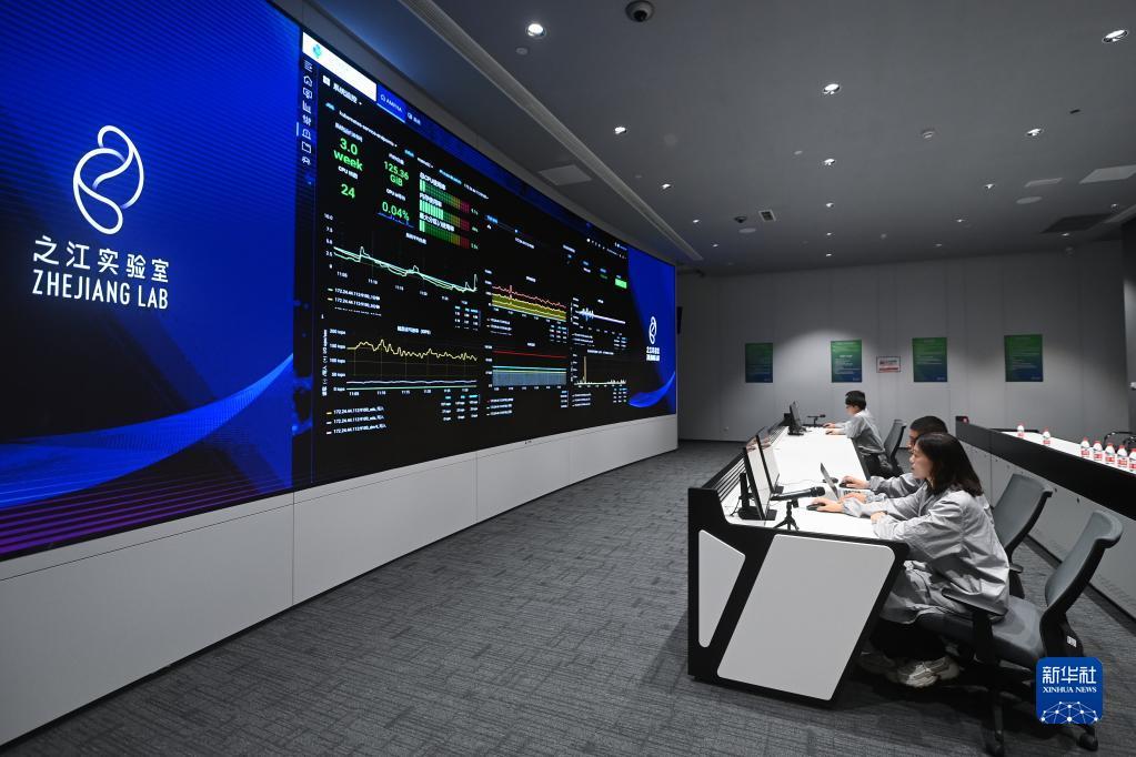 在之江实验室计算与数据中心,工程师们通过“之江云”系统监测服务器集群的运行状态(2022年6月23日摄)。新华社记者黄宗治 摄