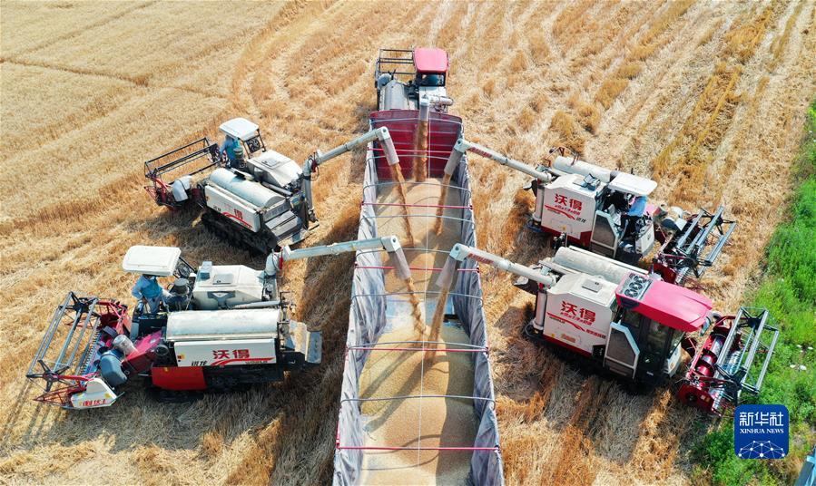 在合肥市蜀山区小庙镇段冲村,收割机将小麦装车,确保颗粒归仓(2022年5月25日摄,无人机照片)。新华社发 陈三虎 摄