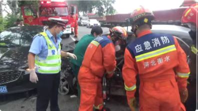 7月22日16时35分,在饶阳县北官庄村附近公路,两辆轿车迎面相撞,一人被困。饶阳县平安路消防救援站立即出动一辆抢险救援车、一辆5吨水罐车,13名指战员赶赴现场救援。