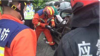 消防指战员到达现场后,发现两辆事故车辆的车头均严重变形,其中一辆停在马路边,另一辆停在马路中间,正驾驶前挡风玻璃破碎,车门严重变形,司机胳膊受伤,被困其中。消防救援人员根据现场情况立即对周围实施警戒,并组织人员利用液压扩张剪对变形车门进行破拆。扩充空间后,消防指战员合力把车门撑开,将被困人员成功救出,并交由现场医护人员处置。