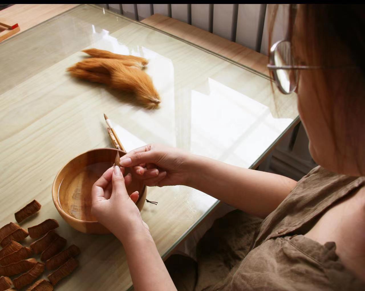 如今,李红玉成立了自己的匠宣麻胎毛笔工作室,每天在工作台上忙碌。“每天至少在案板前坐8个小时,遇到加班就得10多个小时。”选料、水盆、择笔……道道工序都要一丝不苟。