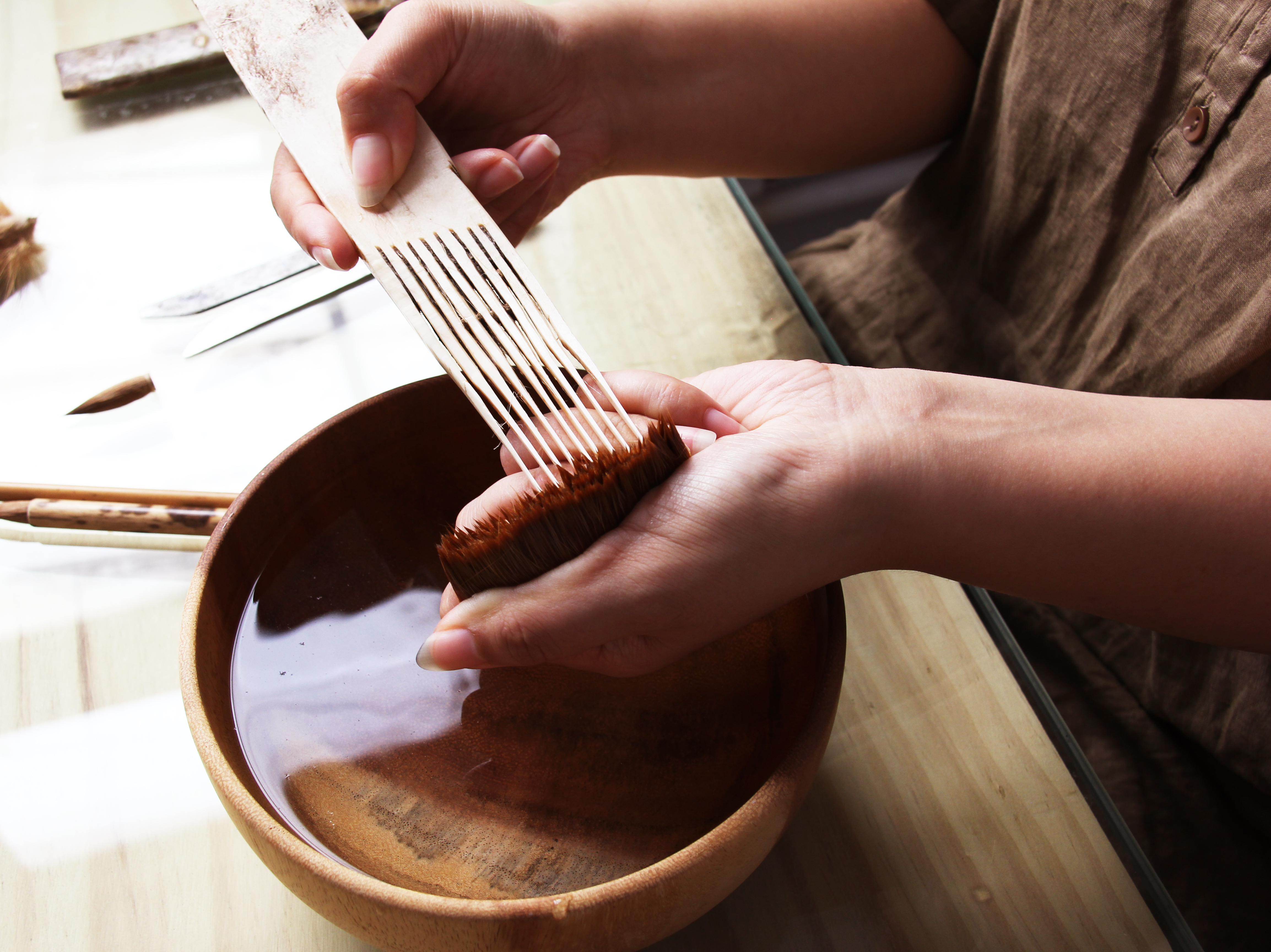 麻胎毛笔制作要经过选料、水盆、零活、干作、包装等5道大工序,80余道小工序。李红玉认为制笔过程中比较繁琐而且易受伤的是混帖子工序。这道工序要求在水中把动物毛料(黄狼尾料、羊毛料、香狸尾毛、兔脊毛)和切好的麻料混合均匀做麻胎,再用尖利的牛骨梳,将麻胎梳理顺滑,单这个过程就需要反复9遍才能完成。
