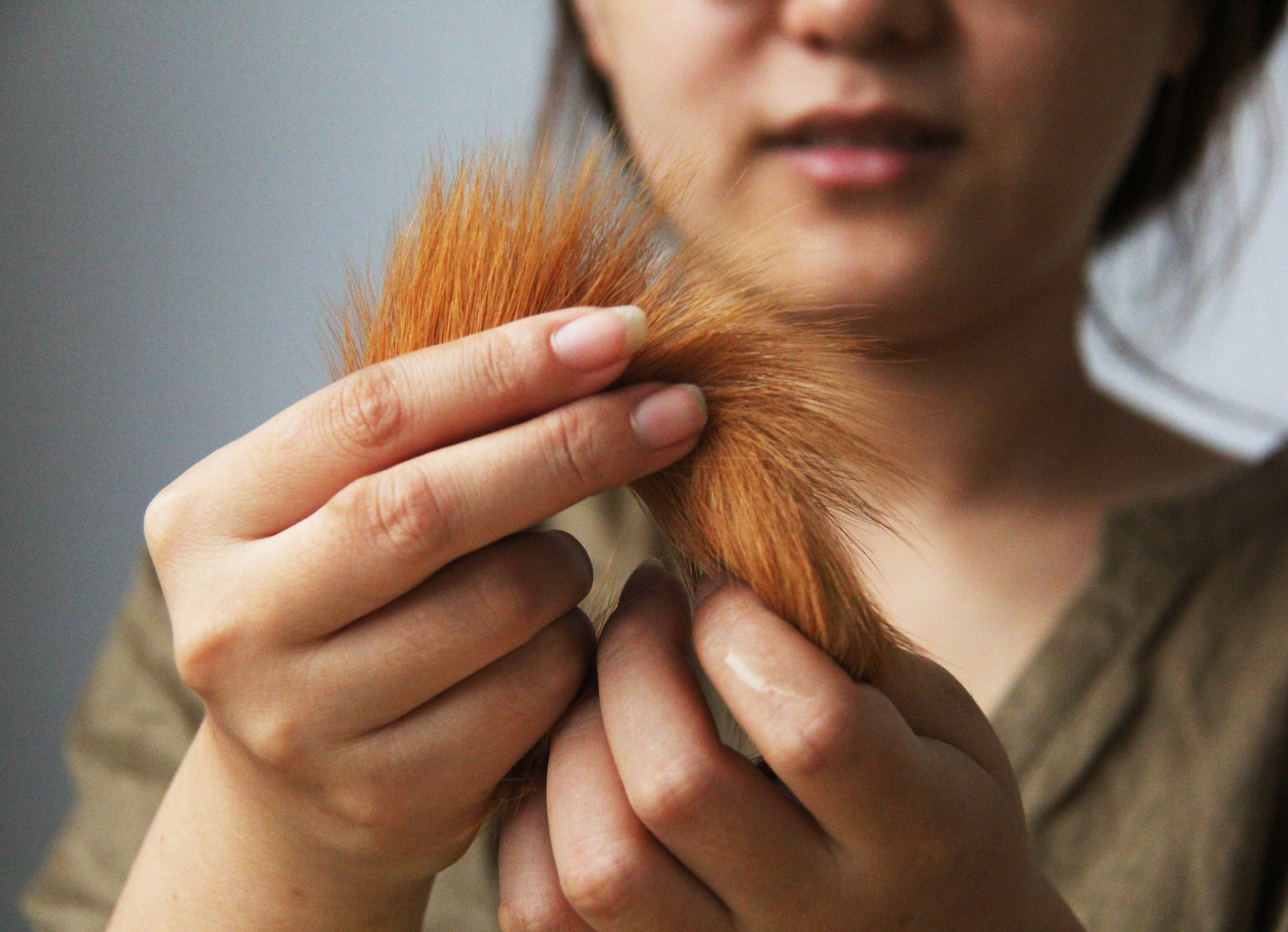 制作最小的毫笔笔头也是比较难的,因为它只有两厘米长。梳理狼毫的时候,手抓一半留一半,抓得松了,梳的时候狼毫会往外掉,抓得紧了,会被牛骨梳子扎手。“虽然我掰手成功,但是由于没有经验,刚开始那段时间,每天都会被牛骨梳、钢梳扎破手指。”李红玉一边说一边让记者看她的左手,“这儿是被牛骨梳子扎破的,这个是被钢梳扎破的,这些伤口反反复复就变成了茧子。”此外,制作毛笔要经过动物毛料去油脂这个过程,李红玉的手经常捏着毛料浸泡在石灰水里,手指缝常常是开裂的,时间一长,手上长满了茧子。这些对于李红玉而言,早已成为家常便饭。经过三年多的“打磨”,李红玉终于出师,学成了整套麻胎毛笔手工制作技艺。