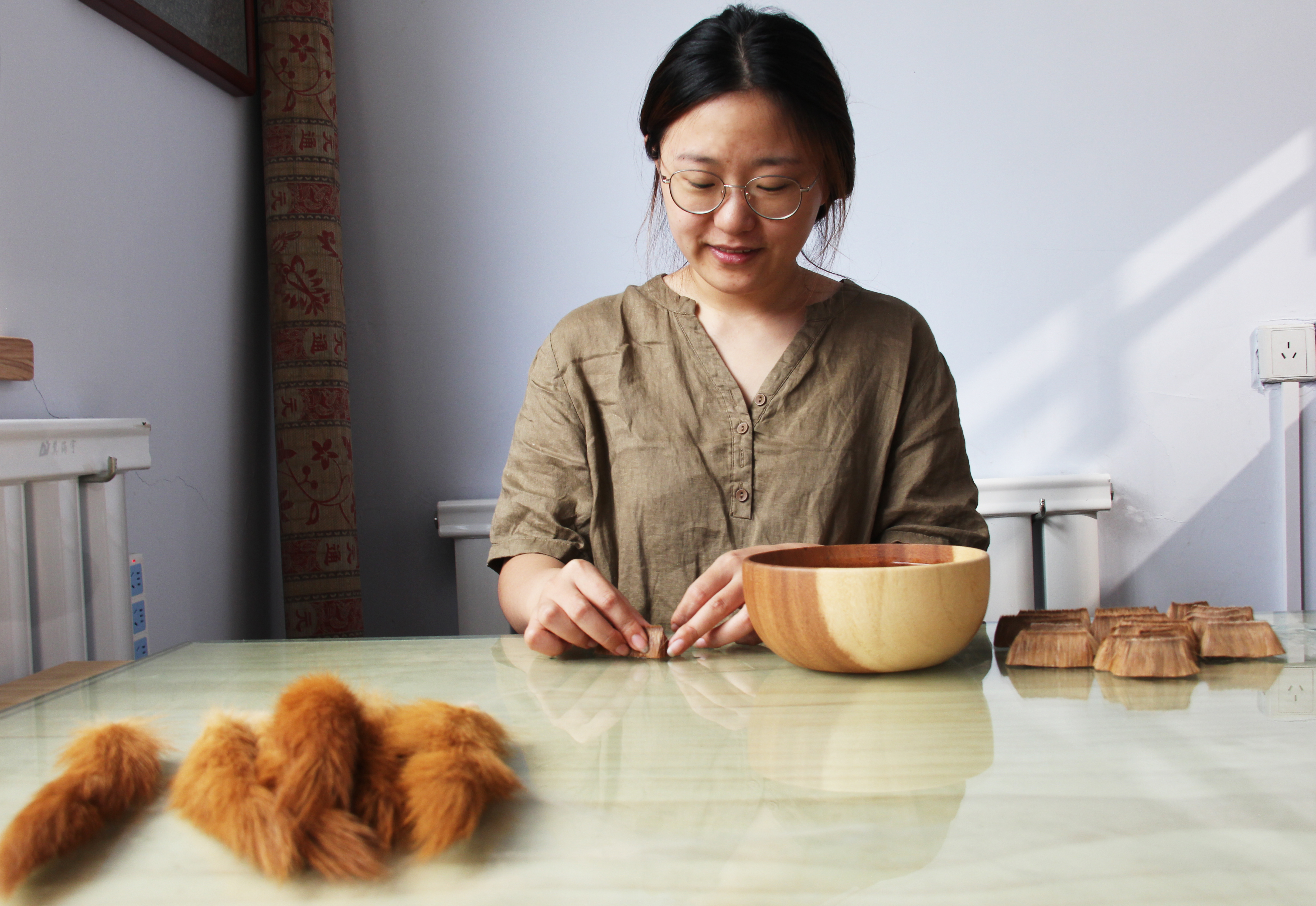 李红玉今年25岁,曾在石家庄一家影楼从事化妆工作,2016年因身体原因回到老家彭杜乡侯店村休养。待在家里的李红玉一度对未来感到迷茫,可当她看到家中的制笔原料时,记忆的闸门一下子打开,她想起小时候外公和妈妈做毛笔的情景。这么多年过去了,已经70岁高龄的外公仍在坚持手工制作麻胎毛笔。一个模糊的念头在李红玉心中逐渐成形,侯店制笔历史悠久,外公的手工制笔技艺精湛,这样的传统技艺正需要年轻人去传承和发扬,这是自己身为侯店人的职责和使命。李红玉决定辞去外面的工作,留在家乡,向外公学习麻胎毛笔制作技艺,将这一传统手工艺传承下去。