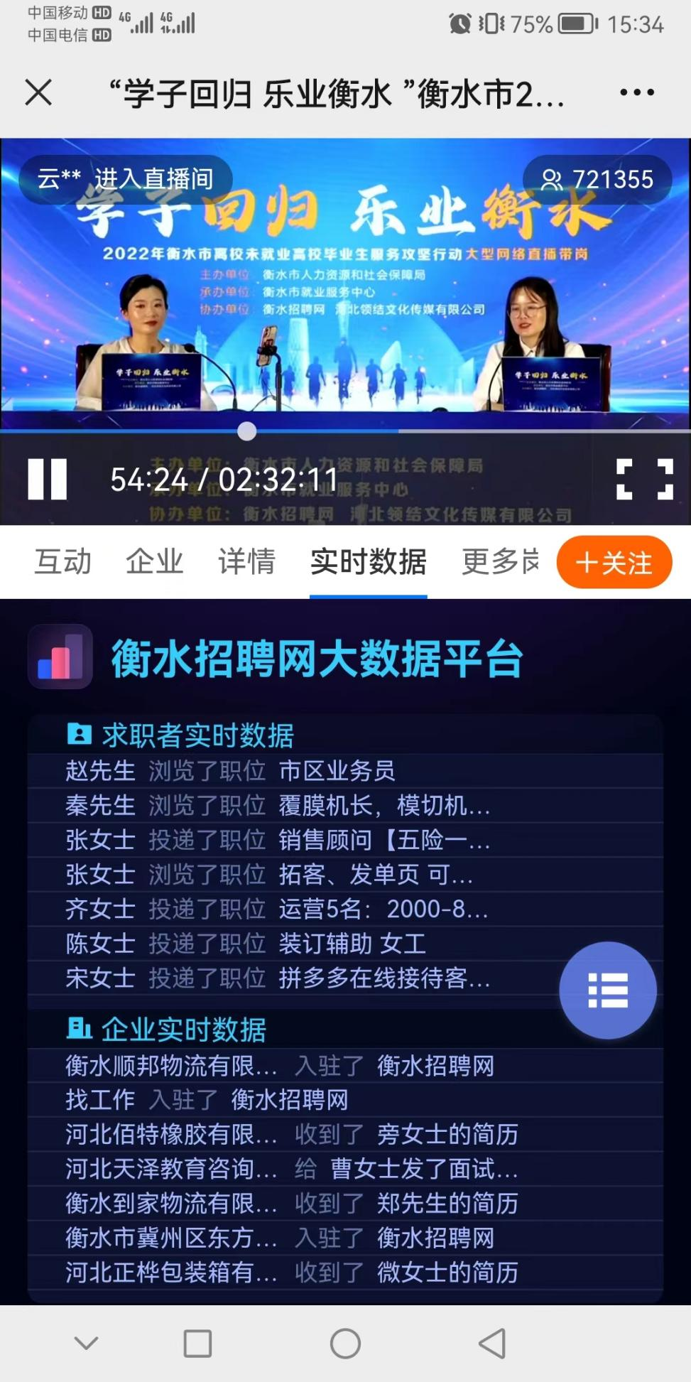 此次活动由市县两级联动,多渠道全方位开展宣传,精准推送活动信息。通过衡水人社公众号、衡水人社微服务对近40万用户进行推送;对12977名2022届离校未就业高校毕业生“一对一”短信推送;积极联系衡水学院、衡水职业技术学院、衡水中学等众多学校,共同助力学子回归;通过衡水招聘网对青年求职群体定点推送。“直播带岗”活动通过衡水招聘网云平台、衡水APP网络直播。2小时直播时间内点击播放量突破72万人次,投递简历人数2782人,简历投递量3772份。