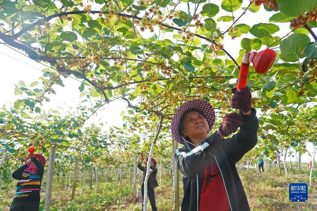 在位于江西宜春市奉新县赤岸镇城下村的“初心园”猕猴桃产业扶贫基地,村民为猕猴桃果树进行人工授粉(2020年4月29日摄)。新华社记者万象 摄