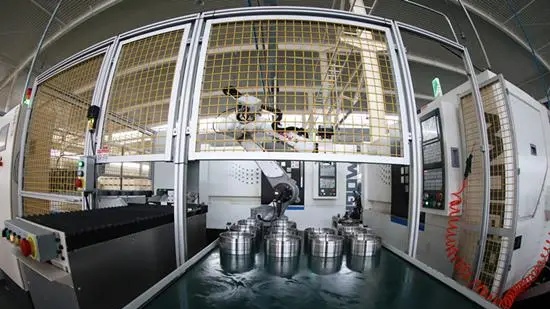 (↑临西县现代化轴承智能工厂生产车间,机器人在控制台操作机器)